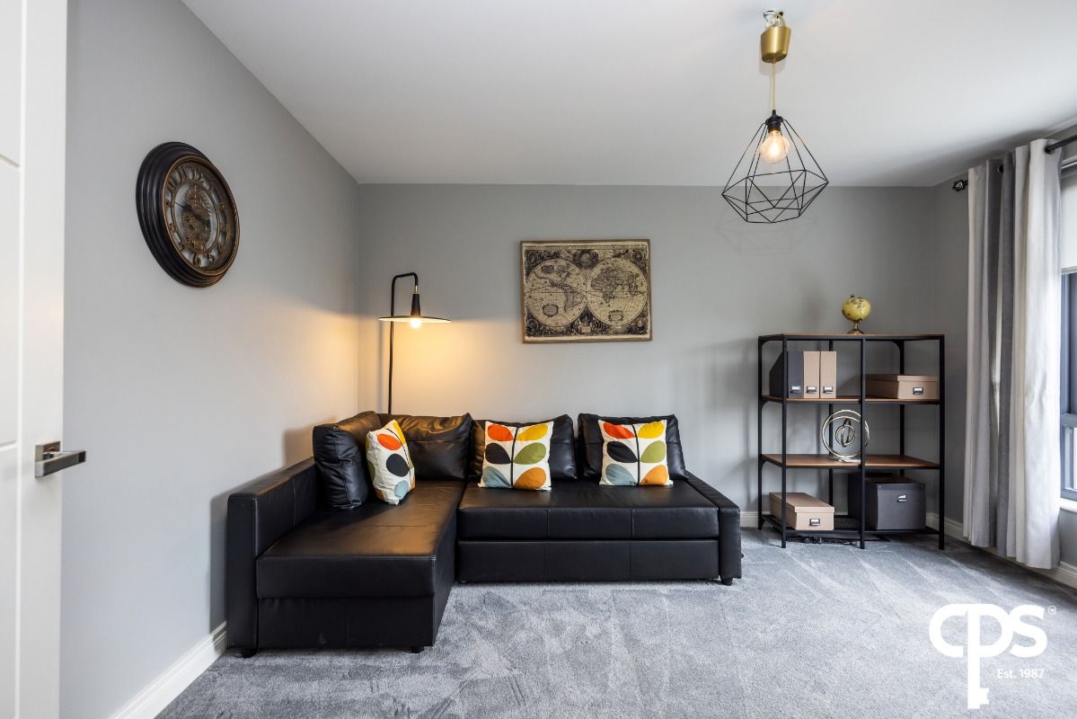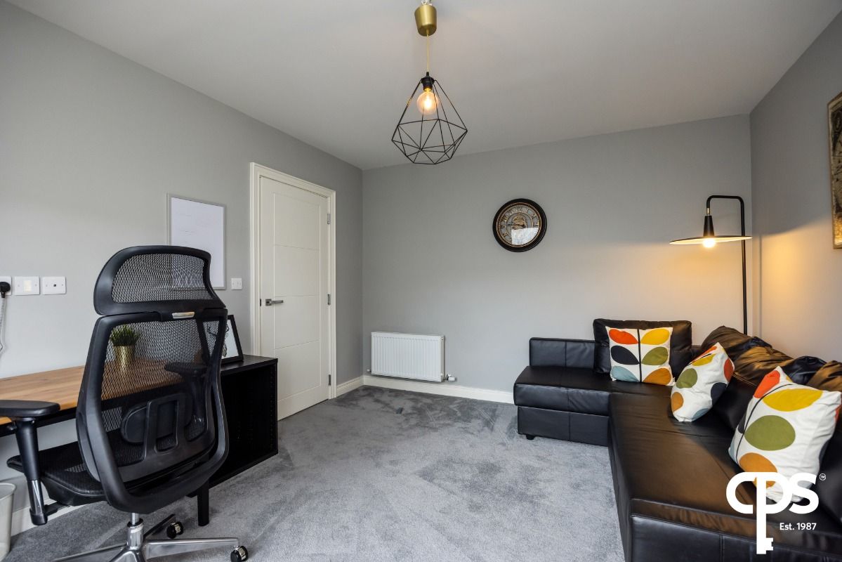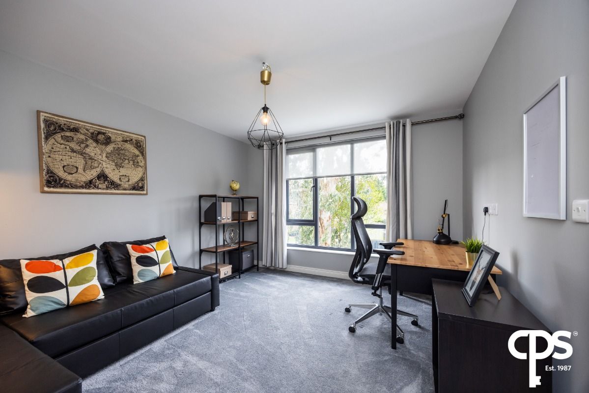 A generous third bedroom benefiting from ample natural light and offering flexibility for a range of uses including a guest bedroom, home office or dressing room. The room provides ample space for furniture and is finished with carpet flooring.