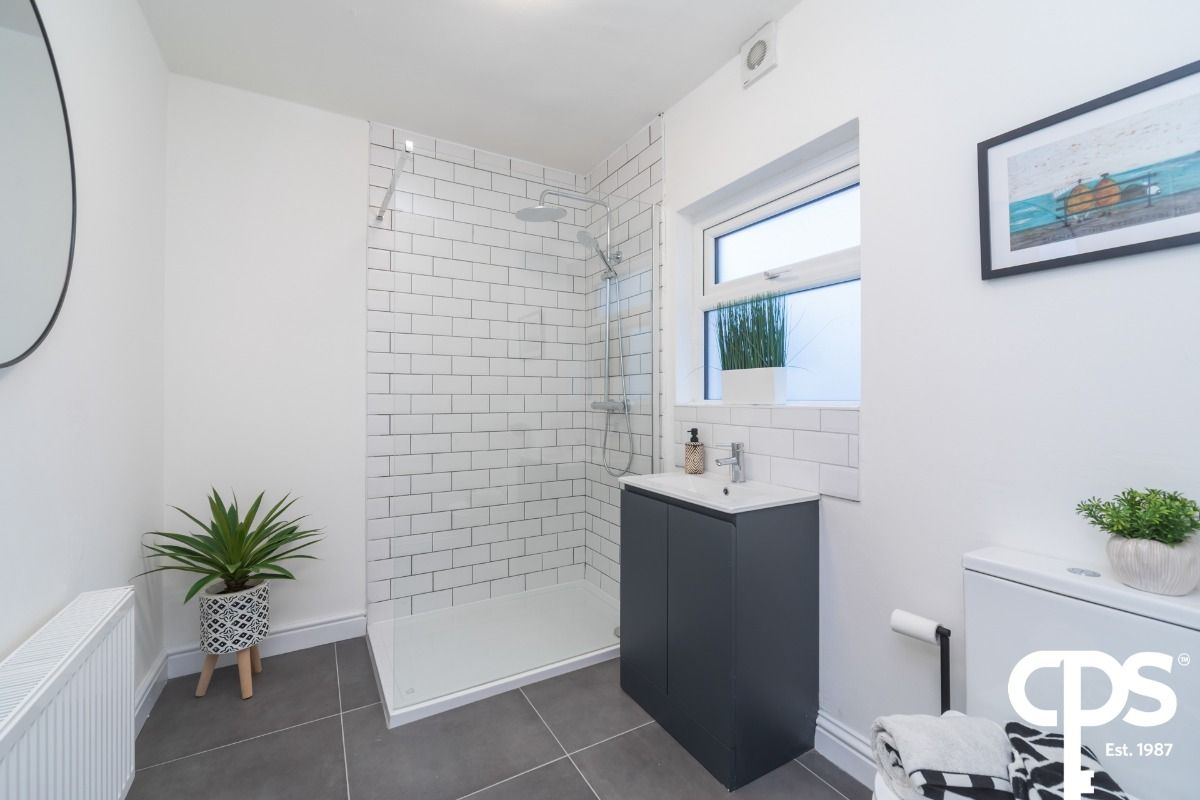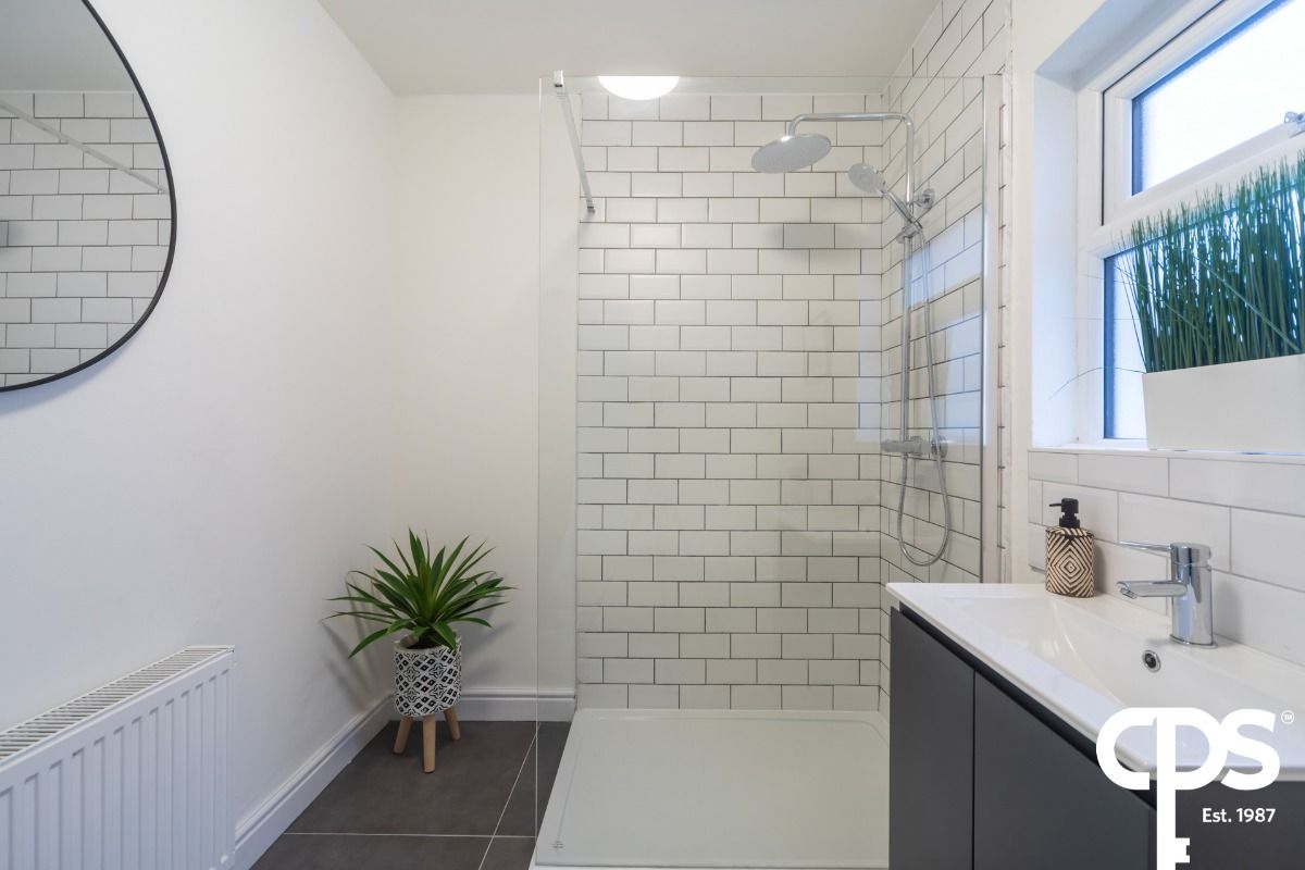 A bright and welcoming open-plan space designed for modern living and entertaining. The newly installed shaker-style kitchen offers a range of high and low units with integrated appliances and ample storage. The room is finished with stylish herringbone flooring and a contemporary feature room divider creating subtle separation from the staircase.