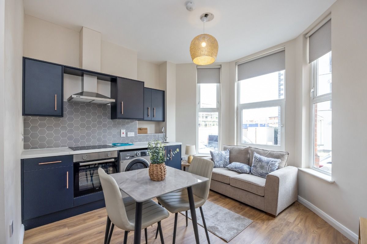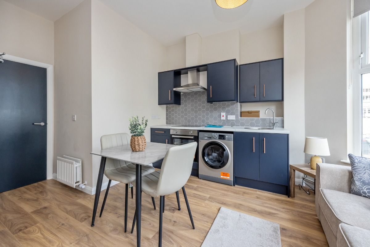 Upon entering the building, you are welcomed by a well-maintained communal hallway, with the apartment itself accessed privately off this space. Inside, you’ll find a bright and spacious open-plan living, kitchen, and dining area—perfect for relaxing or entertaining. The contemporary kitchen is fully equipped, seamlessly blending functionality with sleek design.