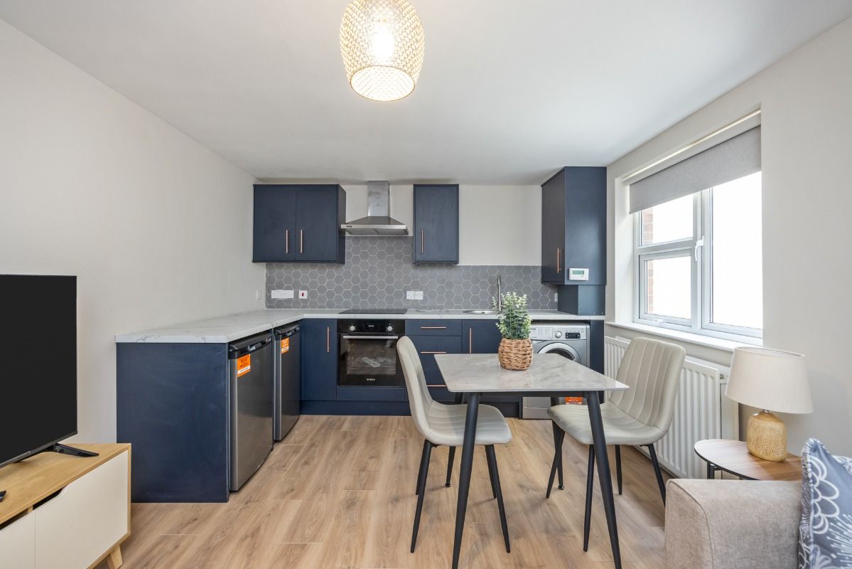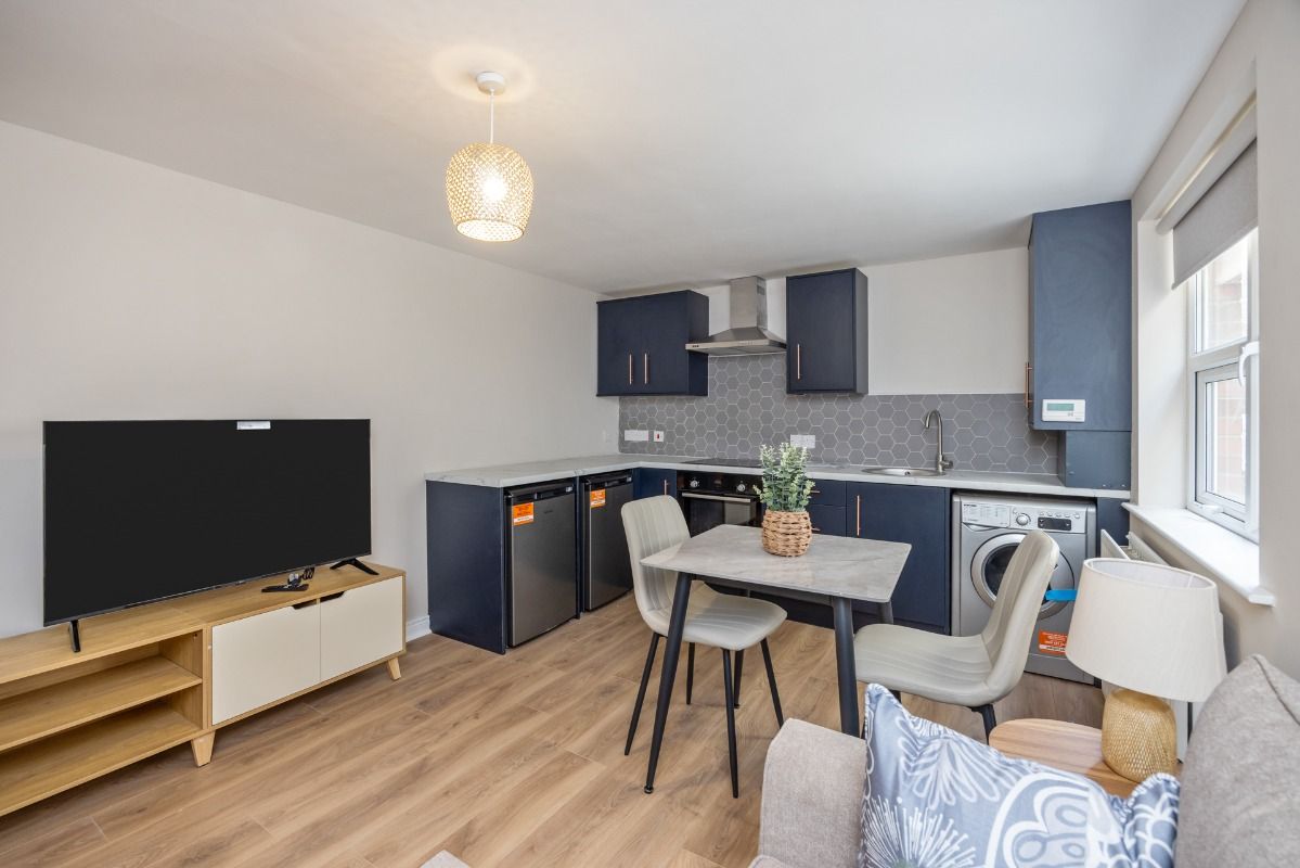 Upon entering the building, you are welcomed by a well-maintained communal hallway, with the apartment itself accessed privately off this space. Inside, you’ll find a bright and spacious open-plan living, kitchen, and dining area—perfect for relaxing or entertaining. The contemporary kitchen is fully equipped, seamlessly blending functionality with sleek design.