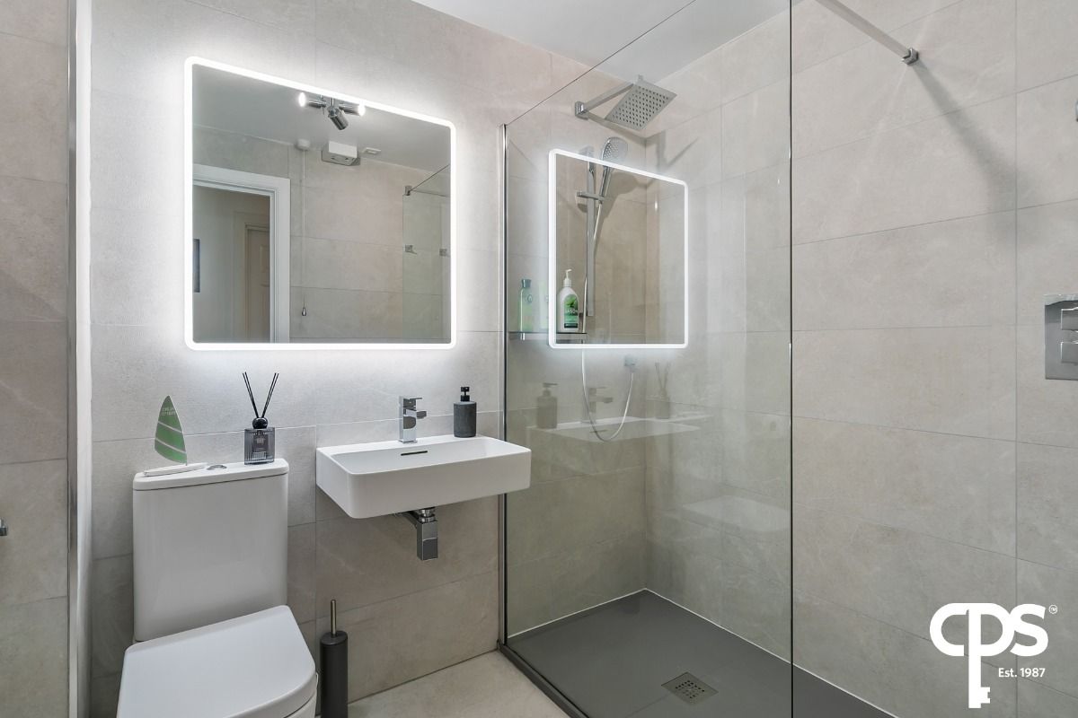 Contemporary bathroom with a newly installed, modern three-piece suite.