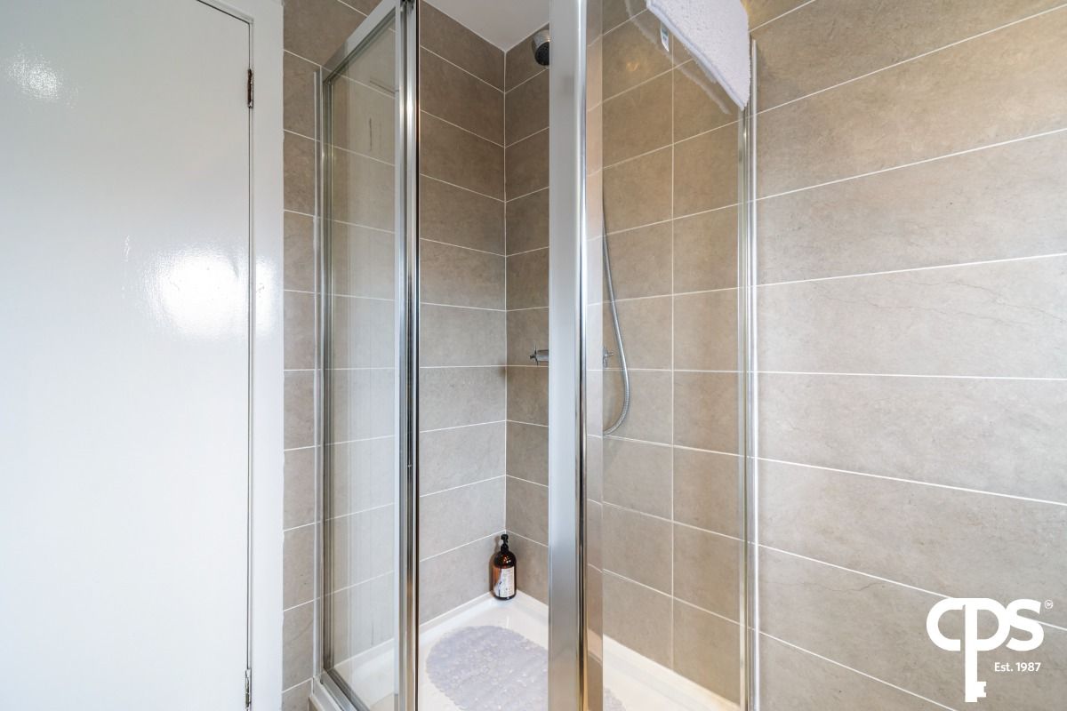 A contemporary bathroom fitted with a white three-piece suite, including low flush WC, wash hand basin and corner shower, finished in a clean and modern style.