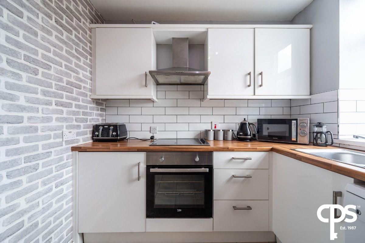 A neatly appointed fitted kitchen comprising a range of high and low-level units, with ample worktop space for food preparation and storage.