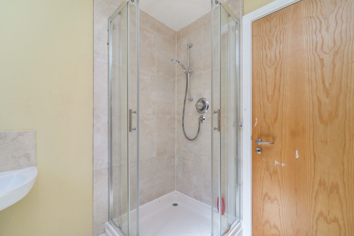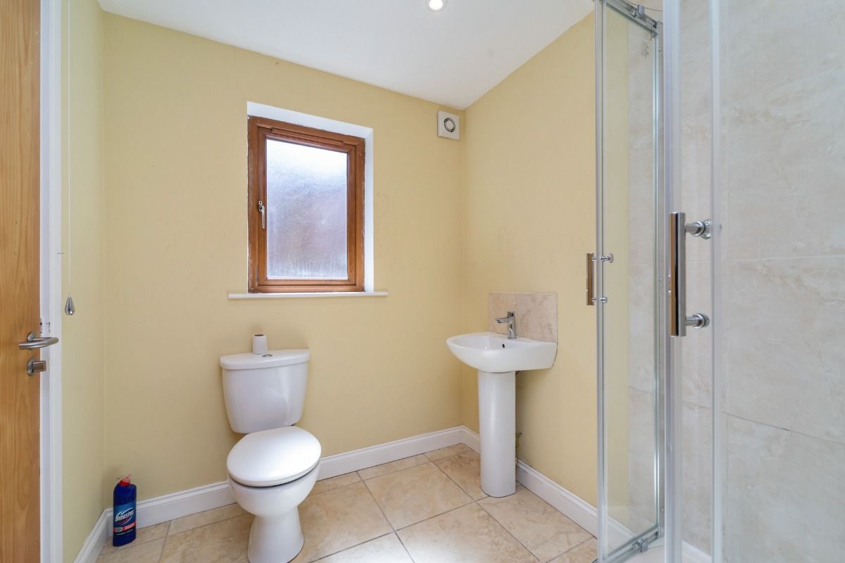 Classic white suite with shower, low flush WC, and wash hand basin.