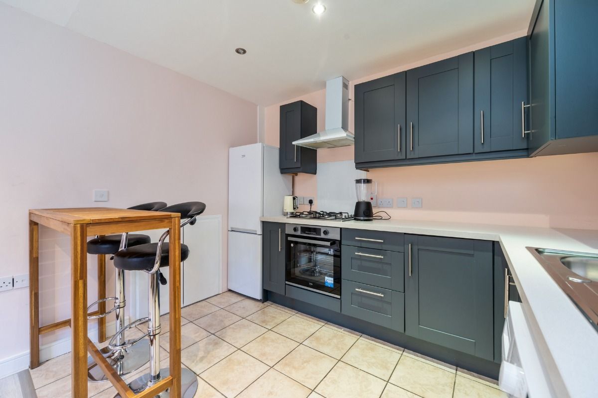 Features a built-under oven and gas hob with integrated extractor fan, single drainer stainless steel sink unit, fridge/freezer space, plumbing for washing machine. Fitted with a range of high and low-level units. Bright and spacious living area with wood laminate flooring. Ample space for dining.