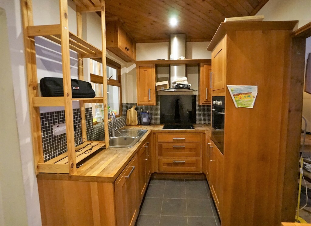 Ample range of high and low level American Oak units. Built in eye level oven and separate electric hob. Stainless steel extractor hood. Tiled floor.