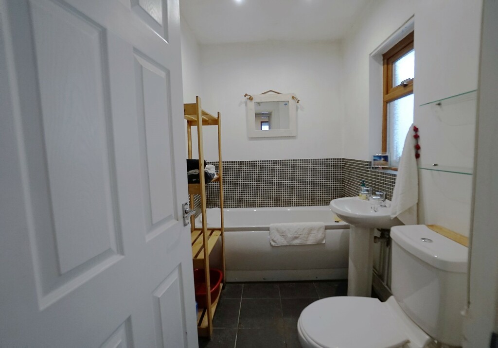 Modern white bathroom suite comprising of low flush WC, pedestal wash hand basin and panelled bath. Chrome towel heater/rail. Tiled floor.