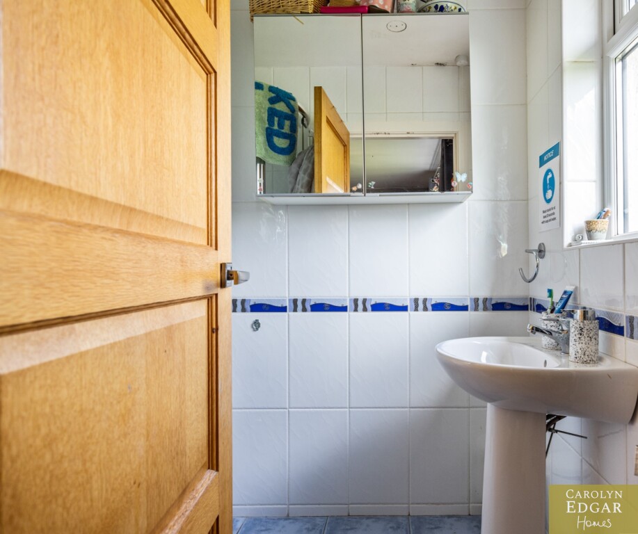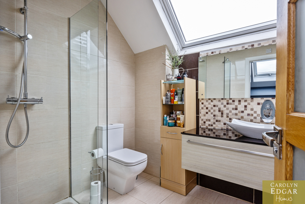 Fully Tiled Shower Enclosure with overhead shower and additional telephone hand shower, low flush WC, pedestal wash hand basin