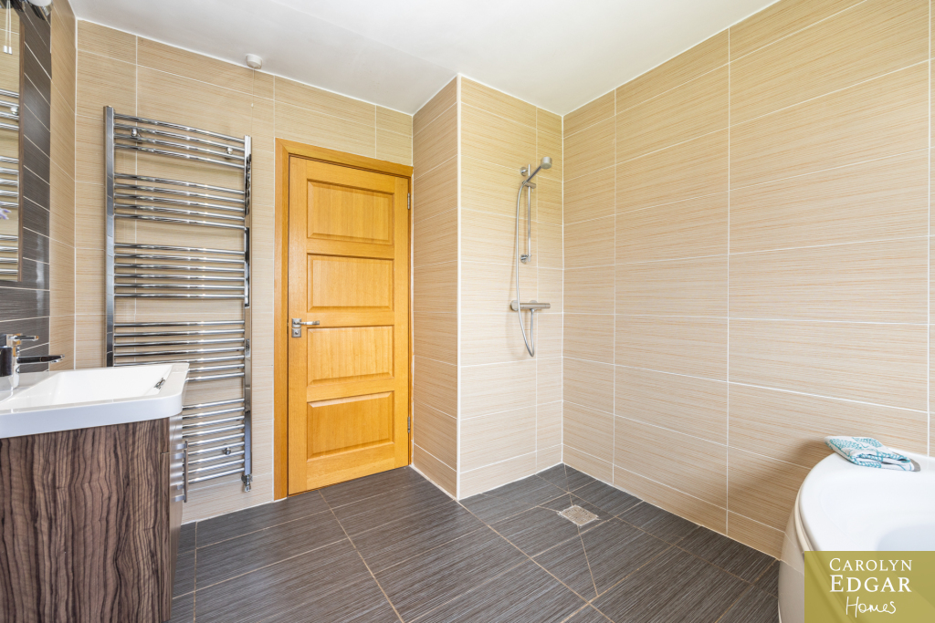 Corner bath, mixer taps, telephone hand shower, Wet Shower area, low flush WC, wash hand basin, heated towel rail