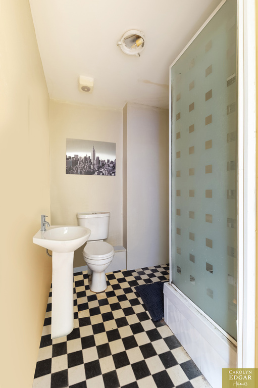 Low flush WC, pedestal wash hand basin, Enclosed shower.