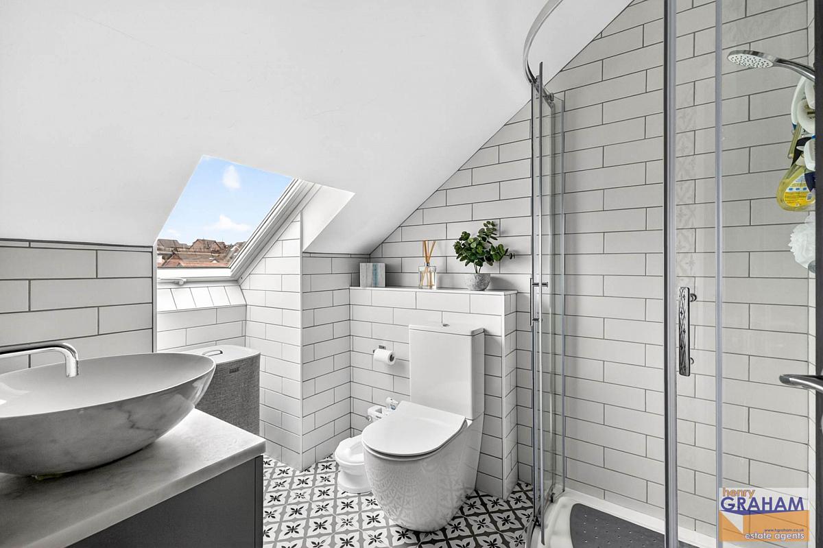 Quadrant shower cubicle with thermostatic shower. Vanity unit with ceramic wash bowl. Close couple low flush WC. Roof window. Tiled walls and floor. Chrome finished heated towel rail.