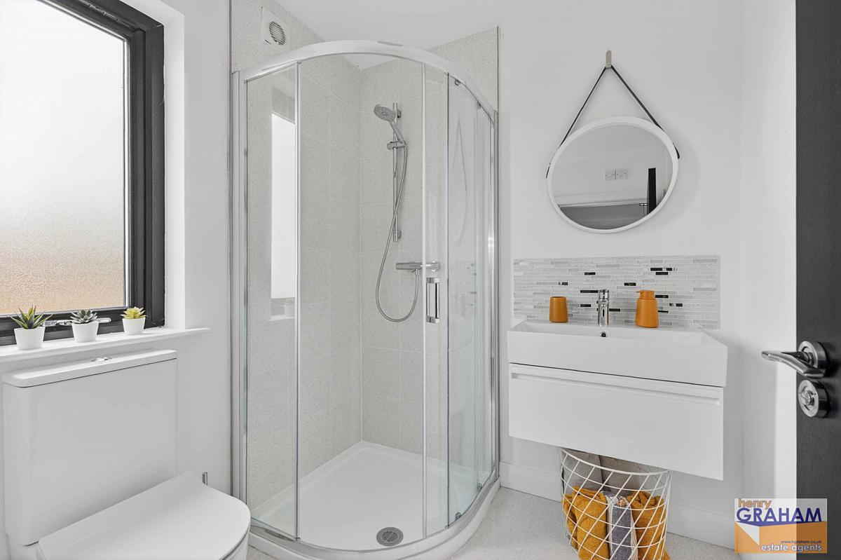 Quadrant shower cubicle. Thermostatic shower. Vanity unit with wash hand basin and mono style mixer tap. Tiled splashback. Close couple low flush WC. Tiled floor. Chrome finish heated towel rail.