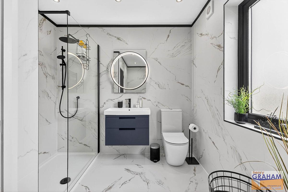 Free standing bathtub. Mixer tap and shower attachment. Large shower enclosure with thermostatic shower, drencher head and shower attachment. Vanity unit with wash hand basin and mono style mixer tap. Close couple low flush WC. Feature marble wall and floor tiling. Recessed spotlights. Heated towel rail.