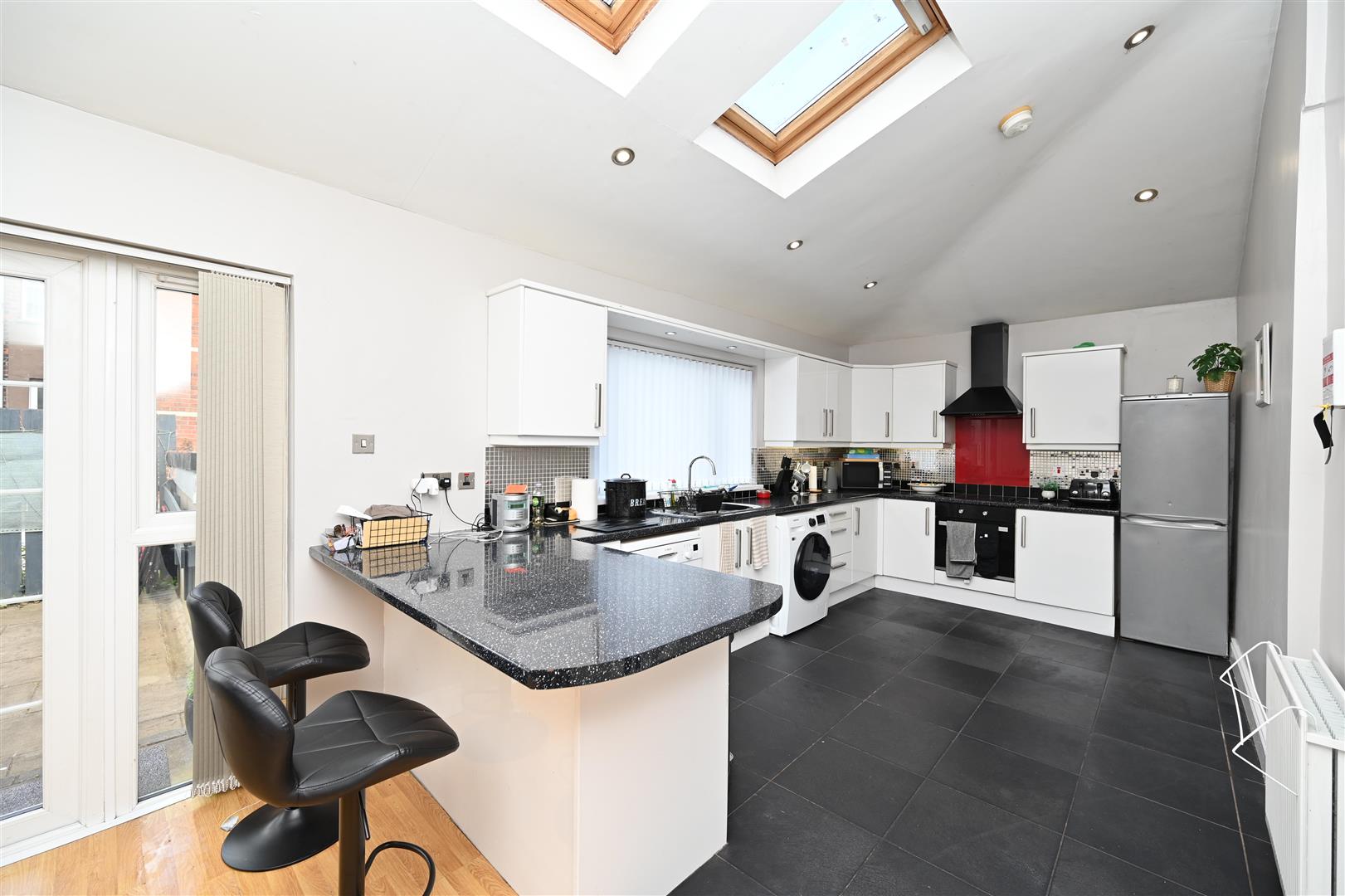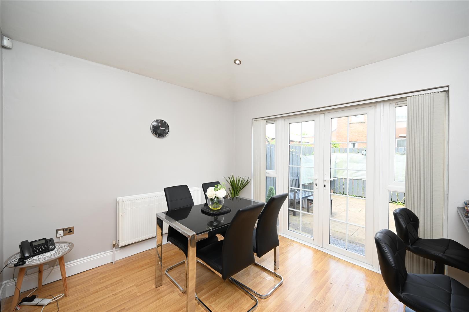 Downstairs comprises of a lounge open plan to a kitchen dining area with access to a rear patio, a modern white high gloss fitted kitchen with appliances and a breakfast bar, two double bedrooms and a shower room. Upstairs comprises of a further three double bedrooms, a master bedroom with an en-suite shower room and a separate main bathroom with a contemporary white suite. The property is further enhanced by having gas-fired central heating, double-glazed windows throughout, an intercom system, a single garage with an electric roller door and a driveway providing off-street parking.