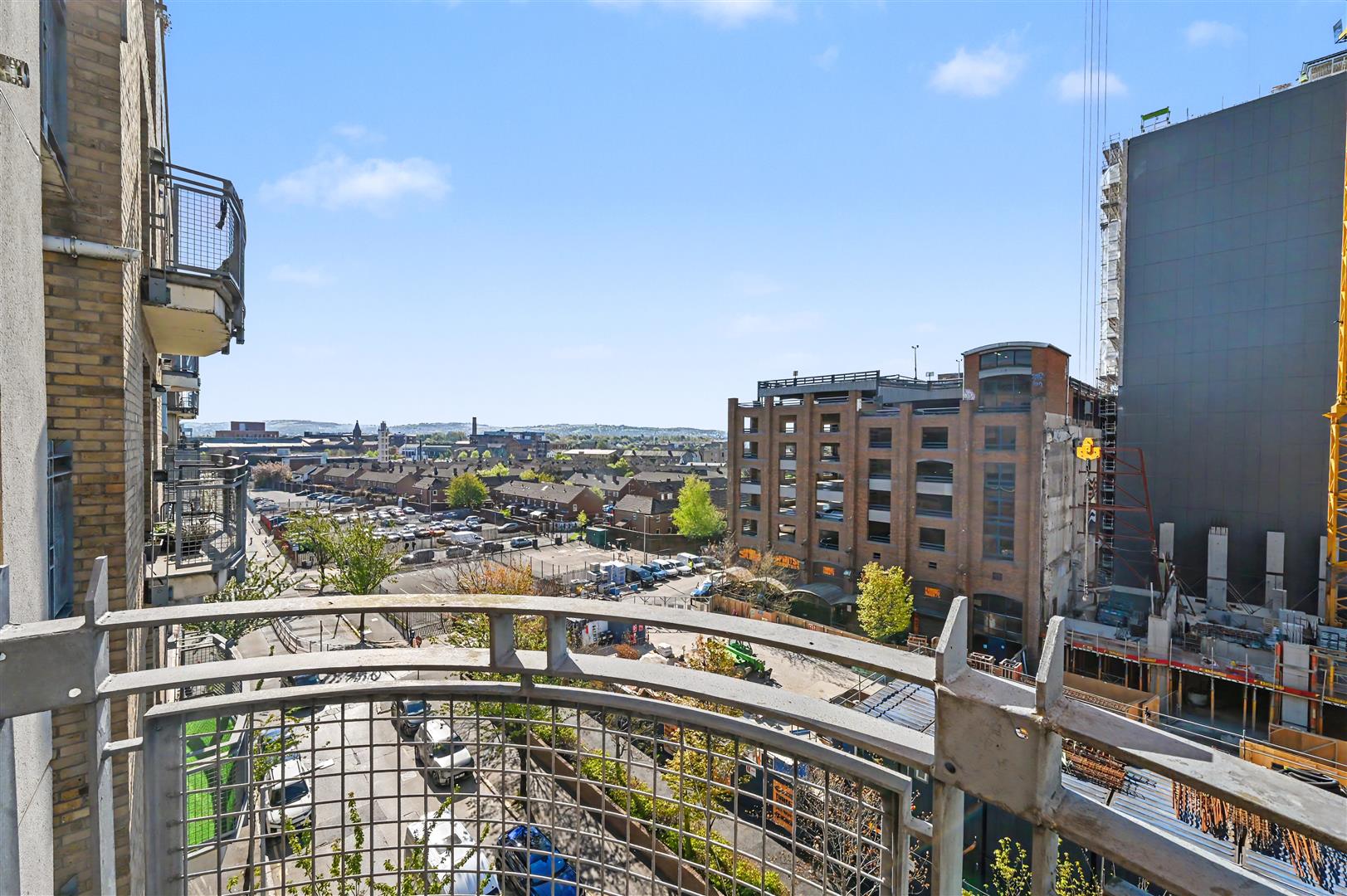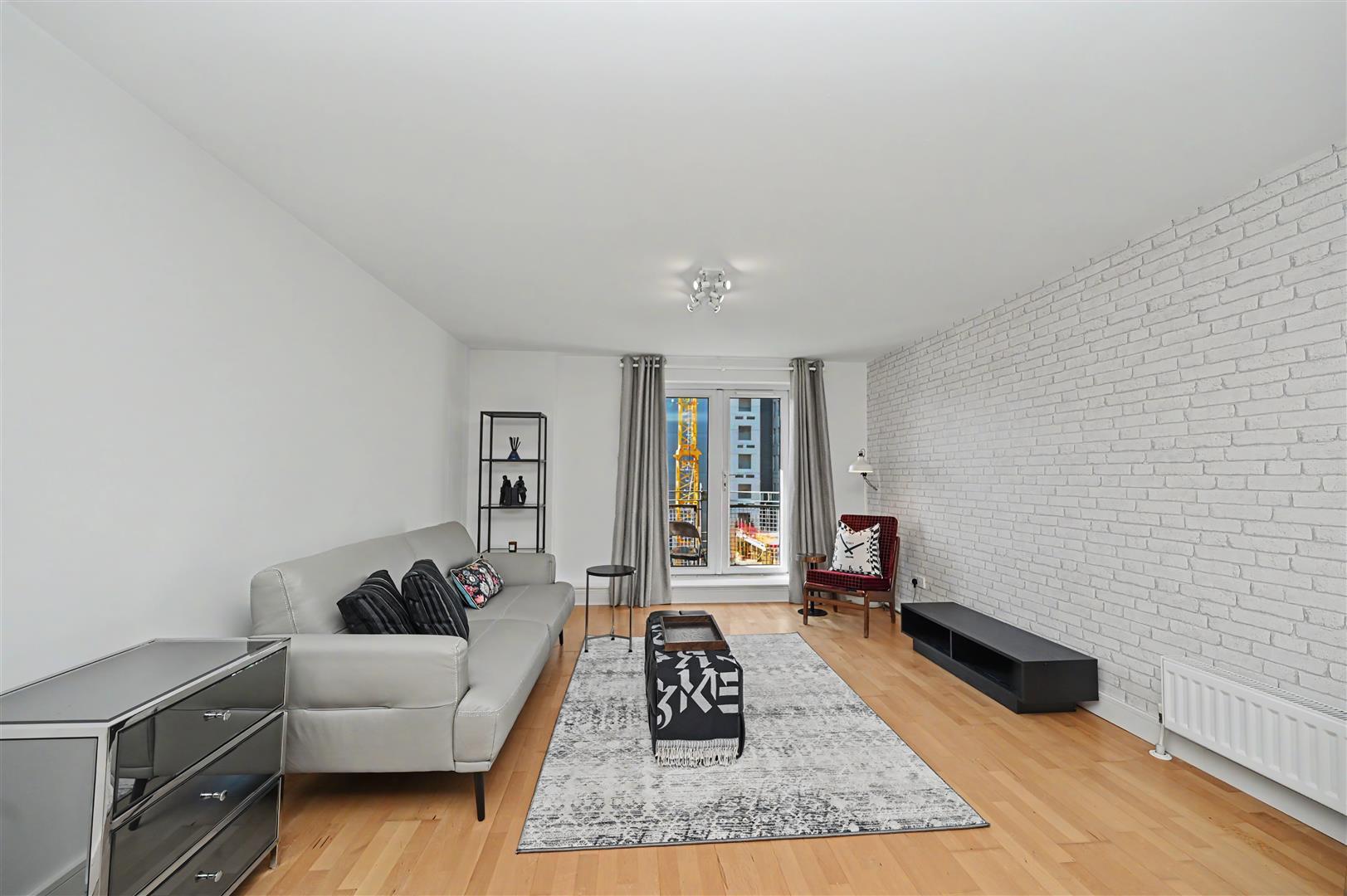 The apartment is finished to a high standard throughout and comprises a welcoming entrance hall with useful storage, leading into a bright and spacious open-plan living, dining, and kitchen area. This space features wooden flooring and direct access to a private balcony overlooking Bankmore Square.