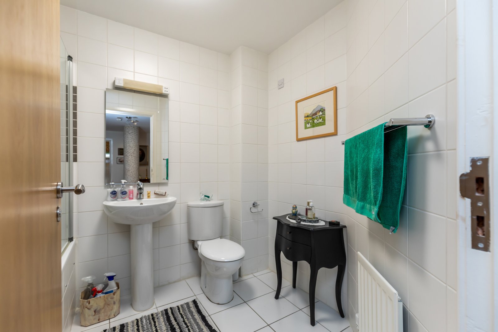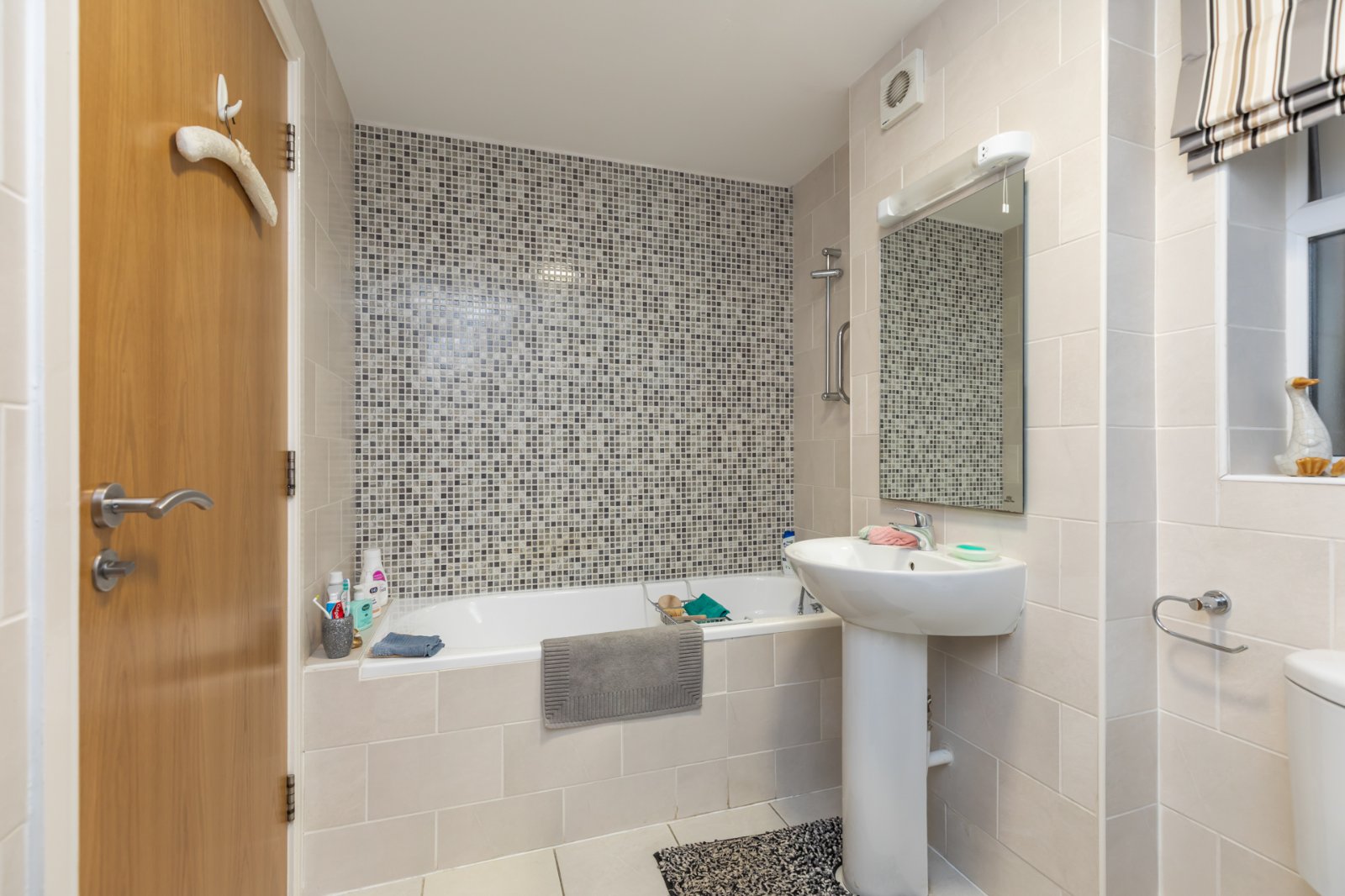 Low flush WC, wash hand basin, tiled panelled bath with mixer taps and telephone hand shower