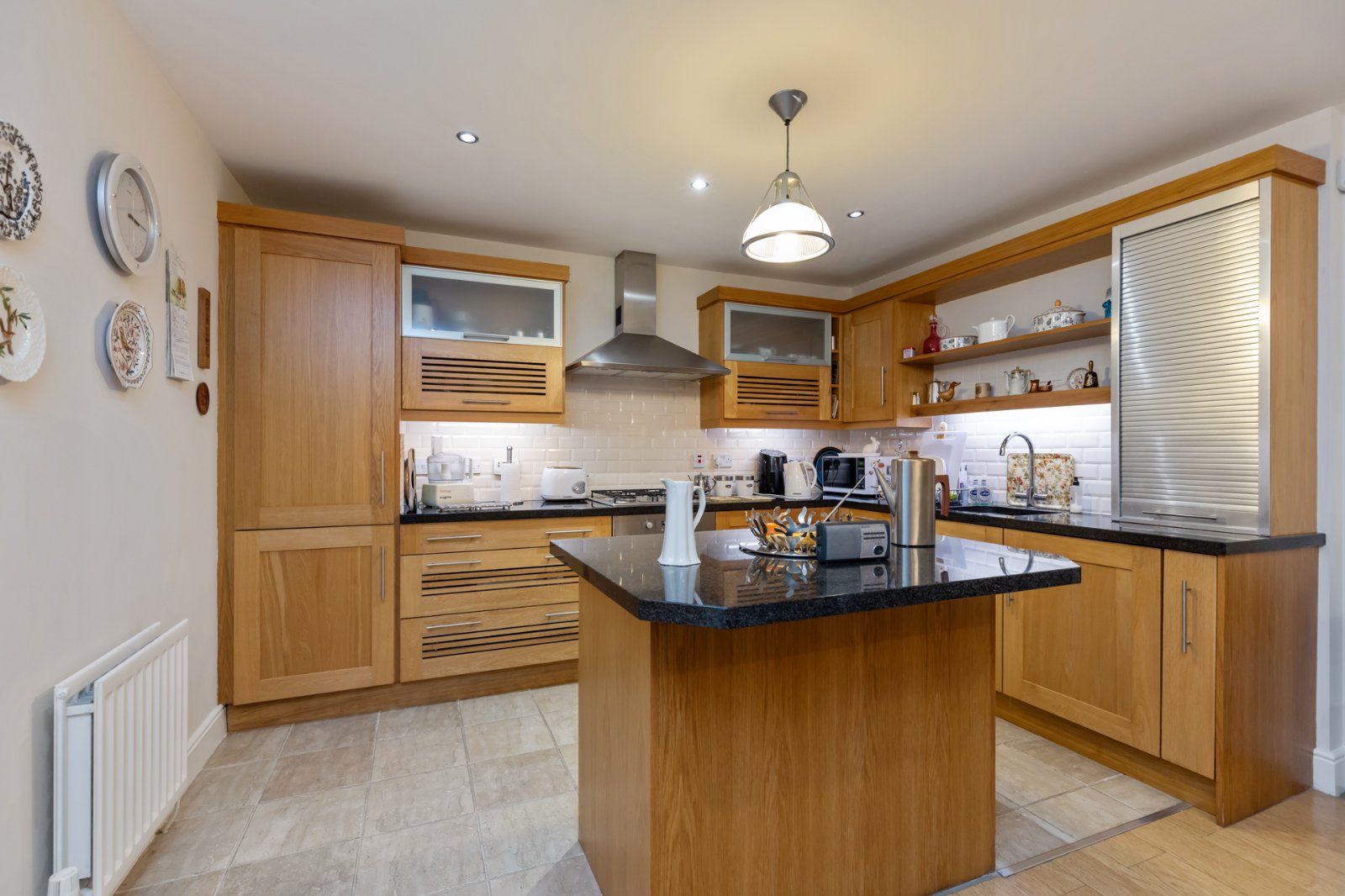 Range of oak high and low level units, granite work surfaces and drainer, stainless steel sink unit, tambour unit, integrated washing machine, integrated dishwasher, integrated oven, four ring gas hob, stainless steel extractor fan, integrated fridge freezer, island with units, granite work surfaces and breakfast bar, part tiled walls, ceramic tiled floor, low voltage spotlights.