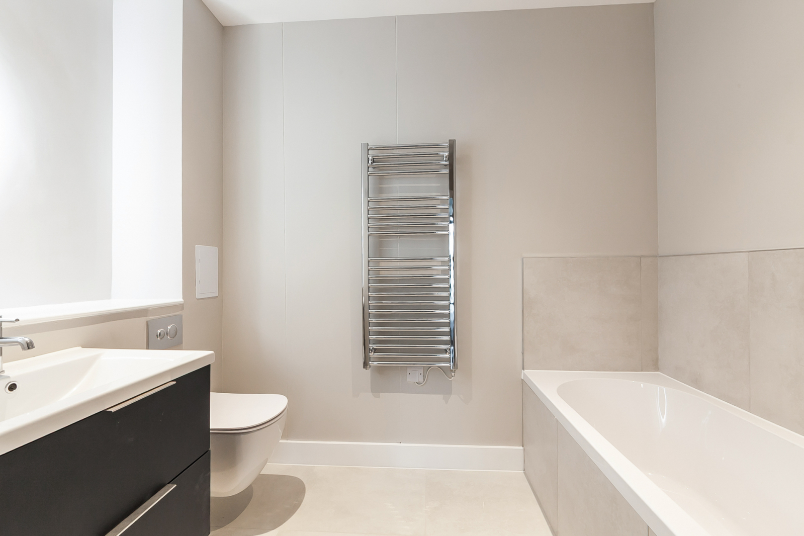 Fully tiled shower enclosure with drencher shower and second attachment, tiled panel bath with tiled surround, vanity wash hand basin with storage, illuminated mirror, low flush W.C, chrome heated towel rail, tiled floor.
