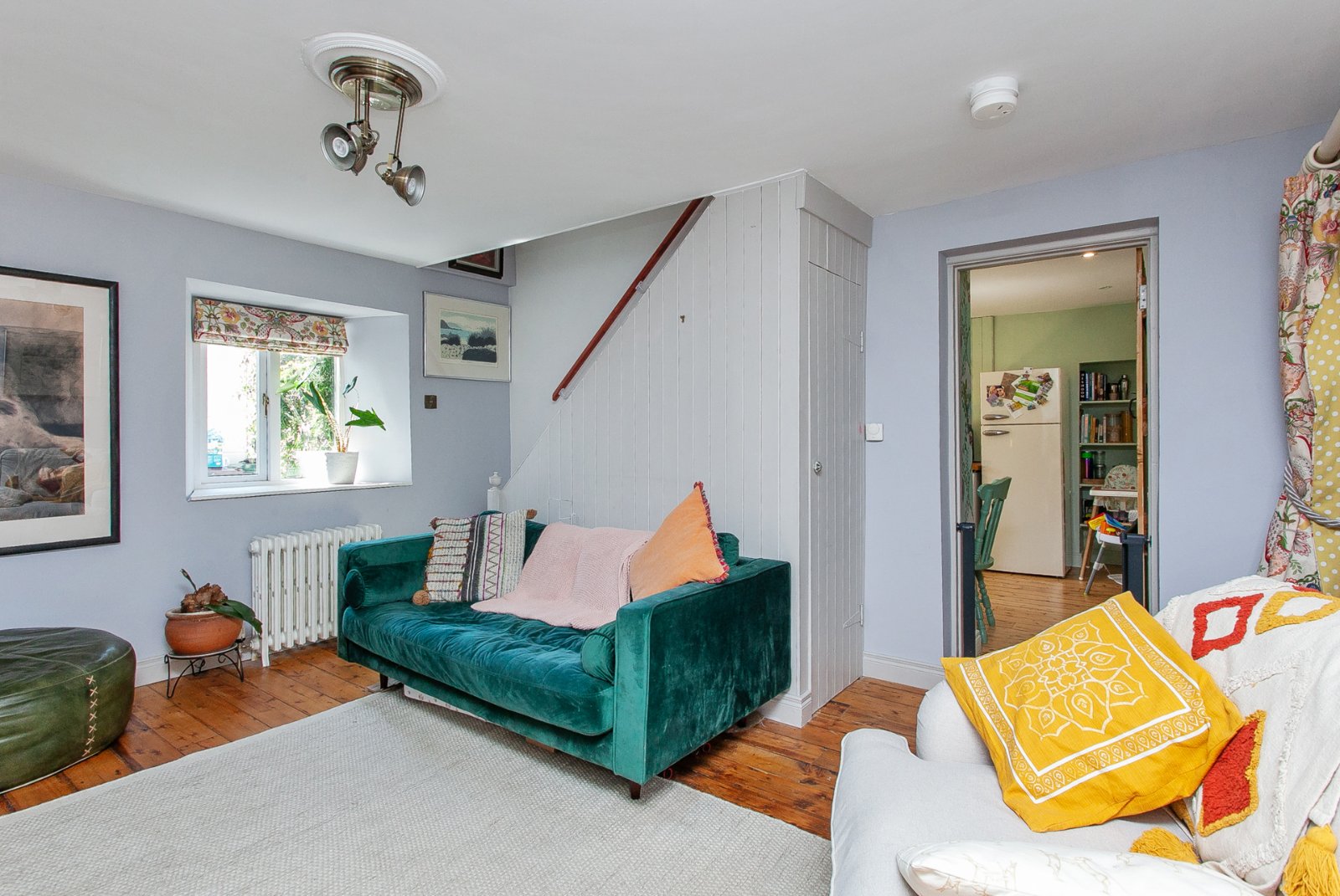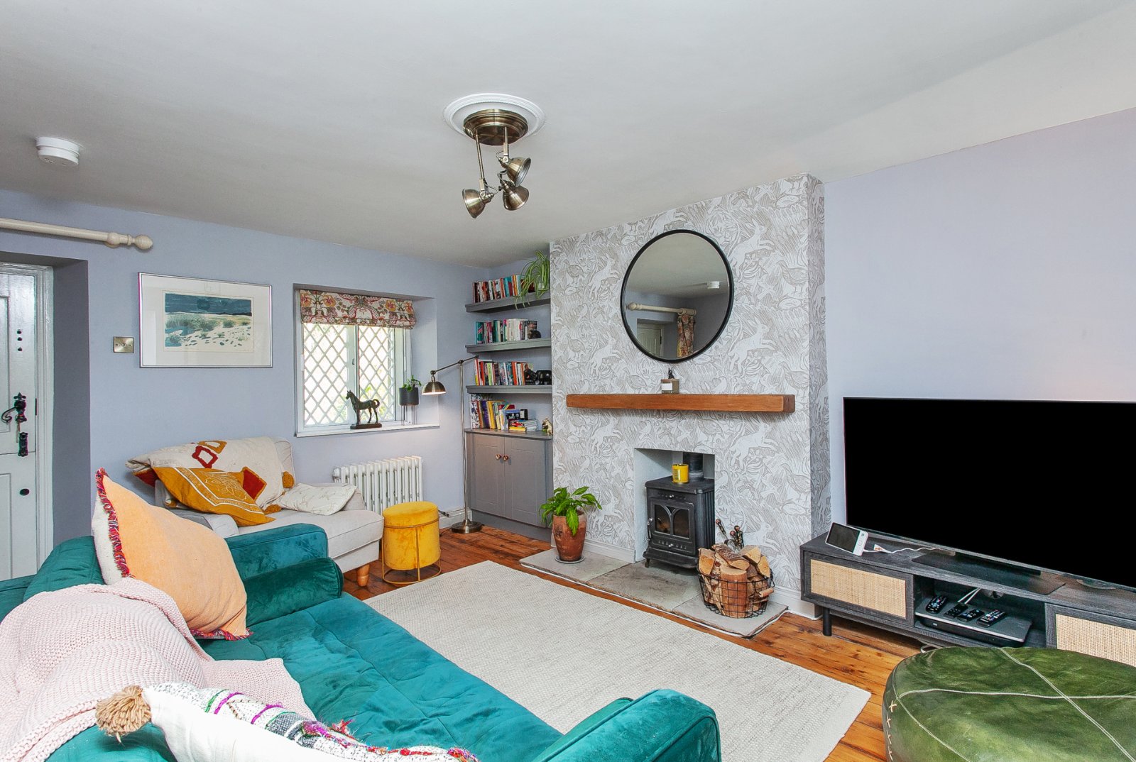 Original wooden floor, wood burning stove.