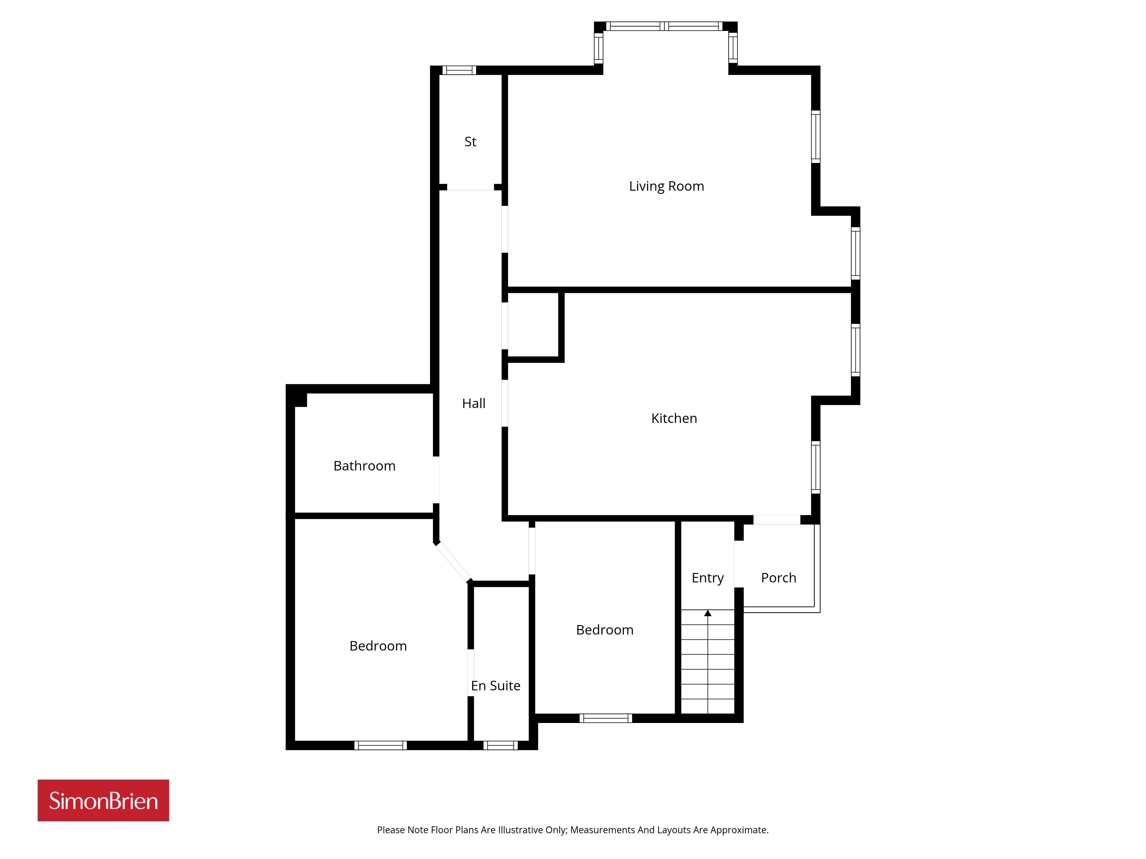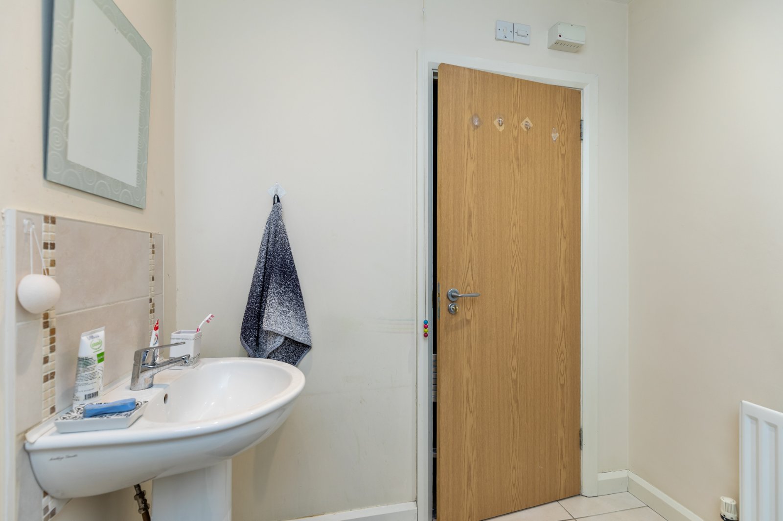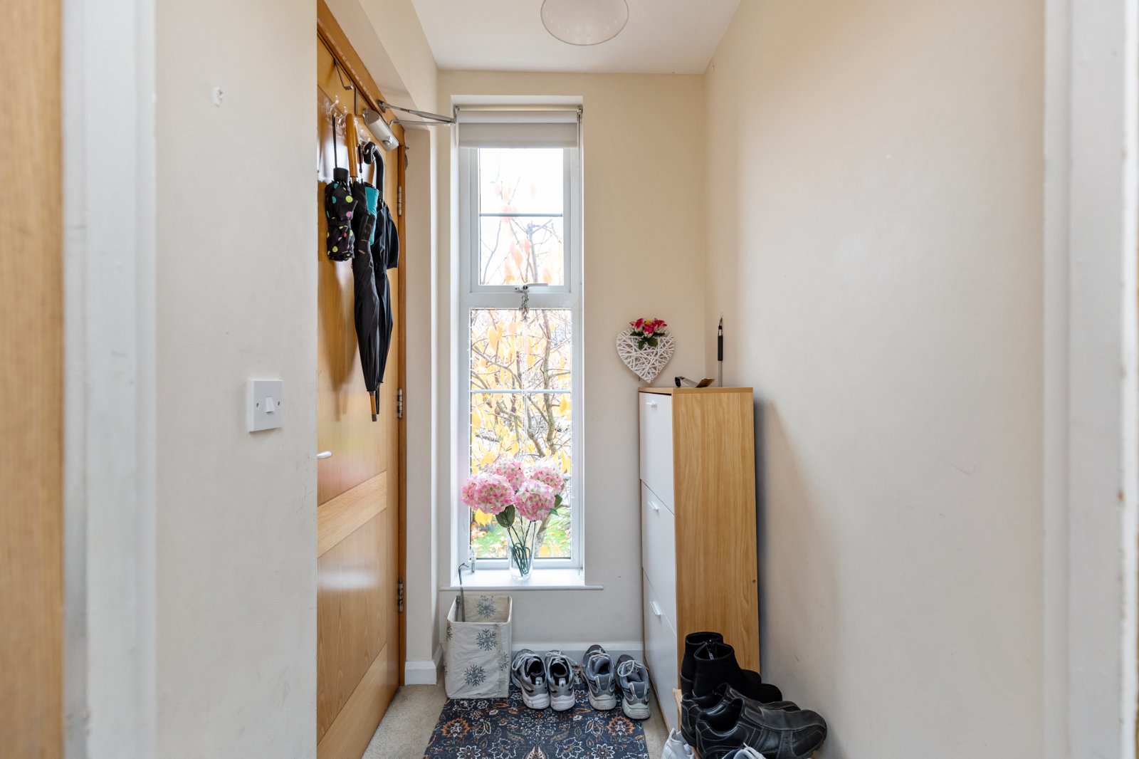 Solid wooden door, entrance porch and built in storage space.