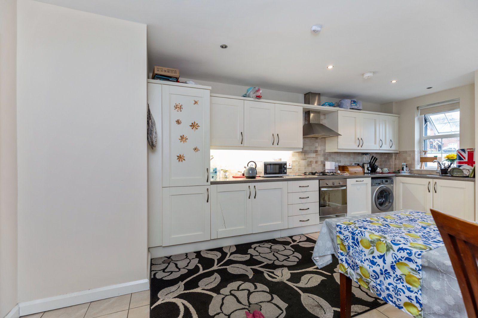 The property comprises a large living area featuring a beautiful bay window, creating a light-filled space perfect for relaxation and entertaining. An adjoining kitchen includes a range of integrated appliances and ample storage, while the formal dining area offers direct access to a private balcony ideal for morning coffee or evening dining.