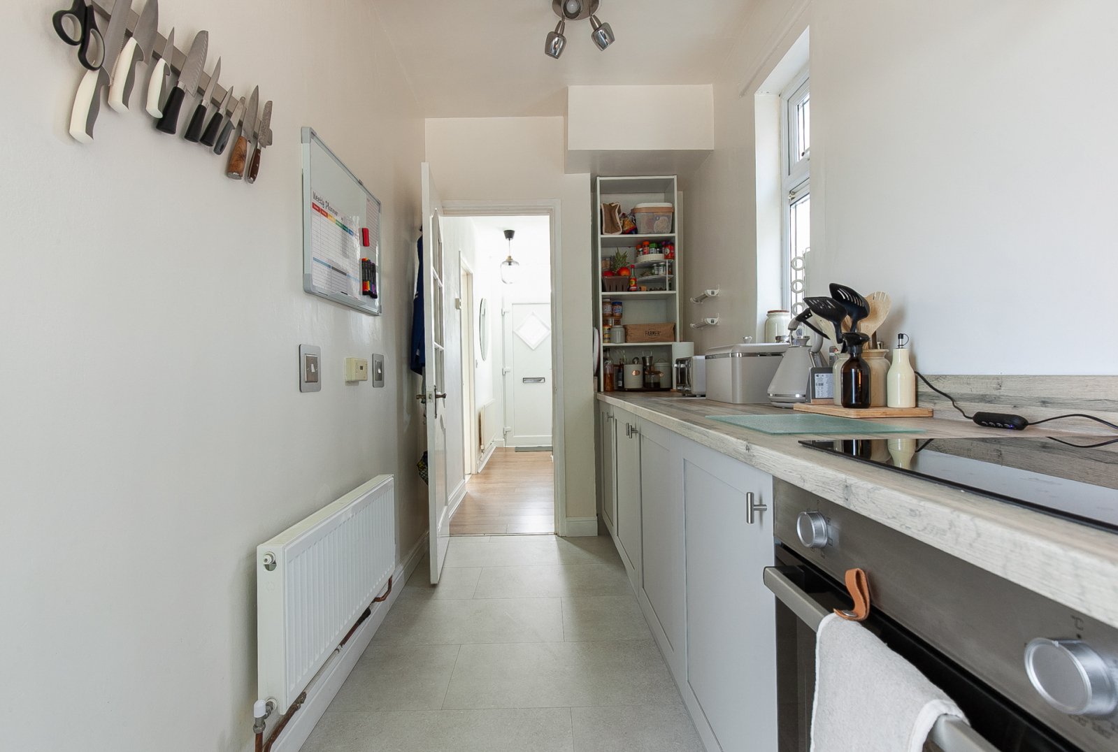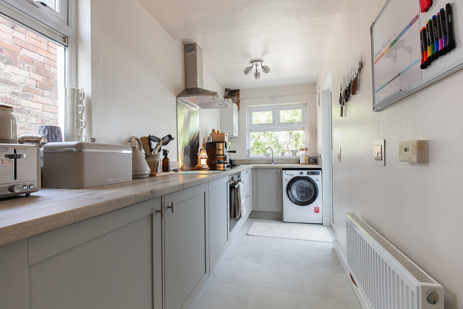 Comprises of excellent range of units, four ring hob with stainless steel splash back and overhead stainless steel extractor unit. Under bench oven, one and a half bowl sink unit with mixer tap, integrated fridge, integrated freezer, plumbed for washer/dryer and access to rear garden .