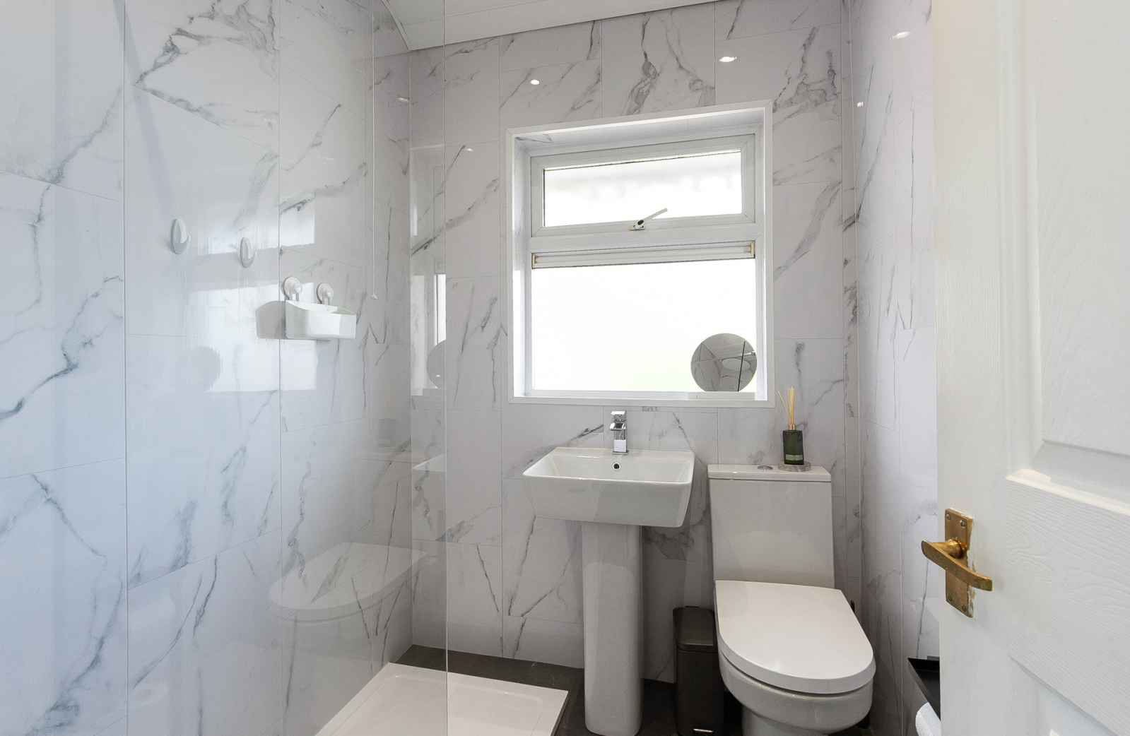 Comprises of walk in shower with glass shower screen, pedestal wash hand basin with mixer tap, low flush WC, heated towel rail, recessed lighting and extractor fan.