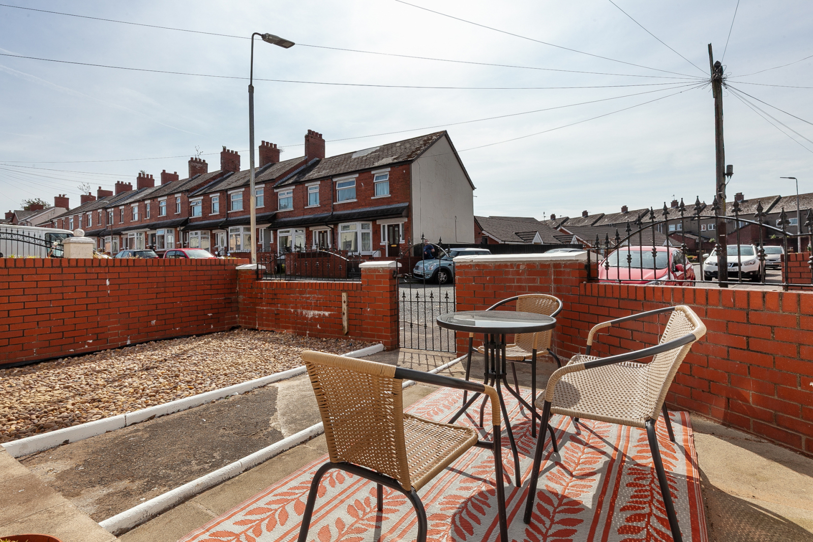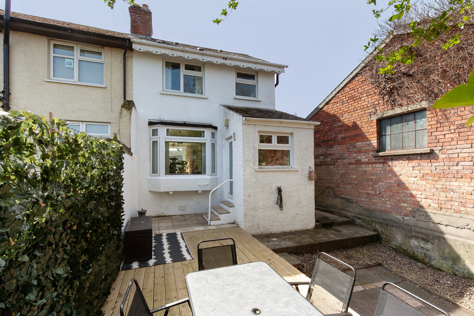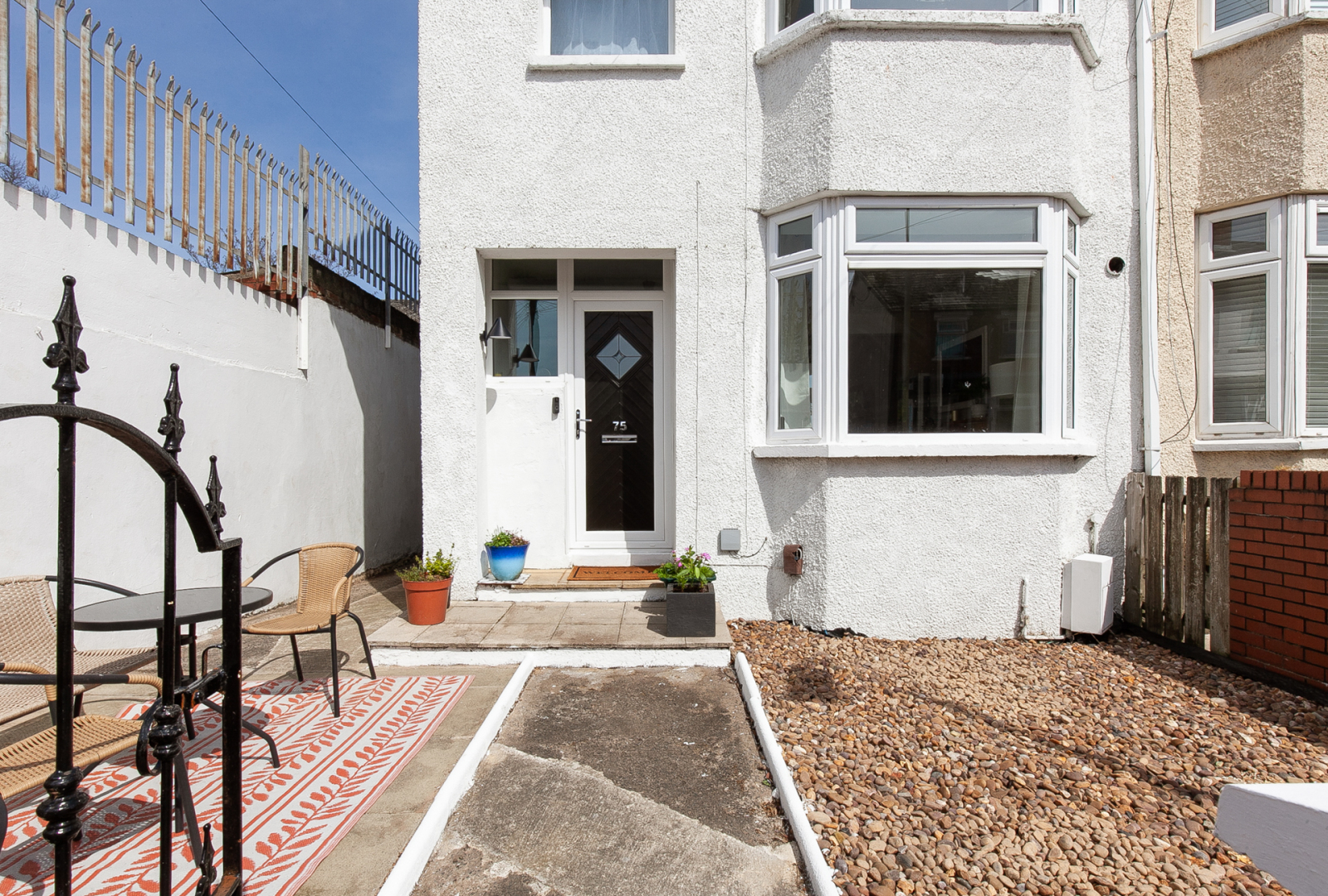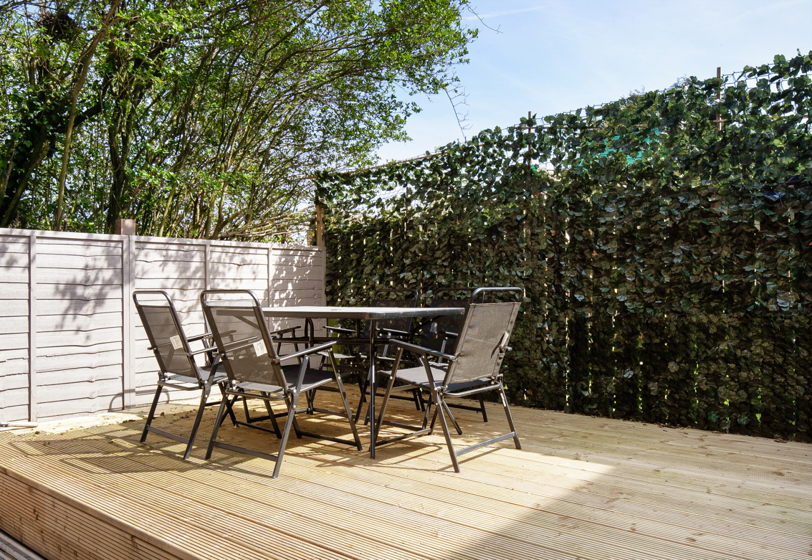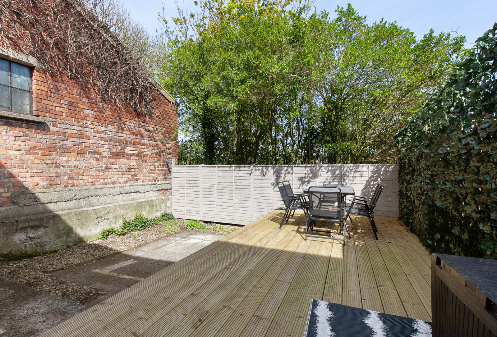 Enclosed rear garden with sunny aspect and raised decking. Front with enclosed forecourt , sunny aspect, light and tap.