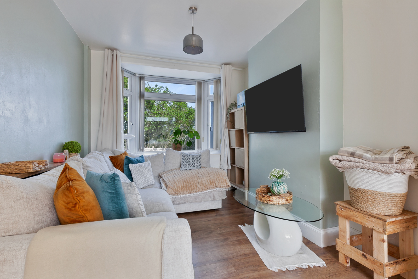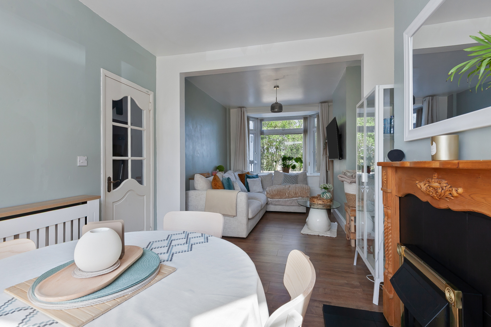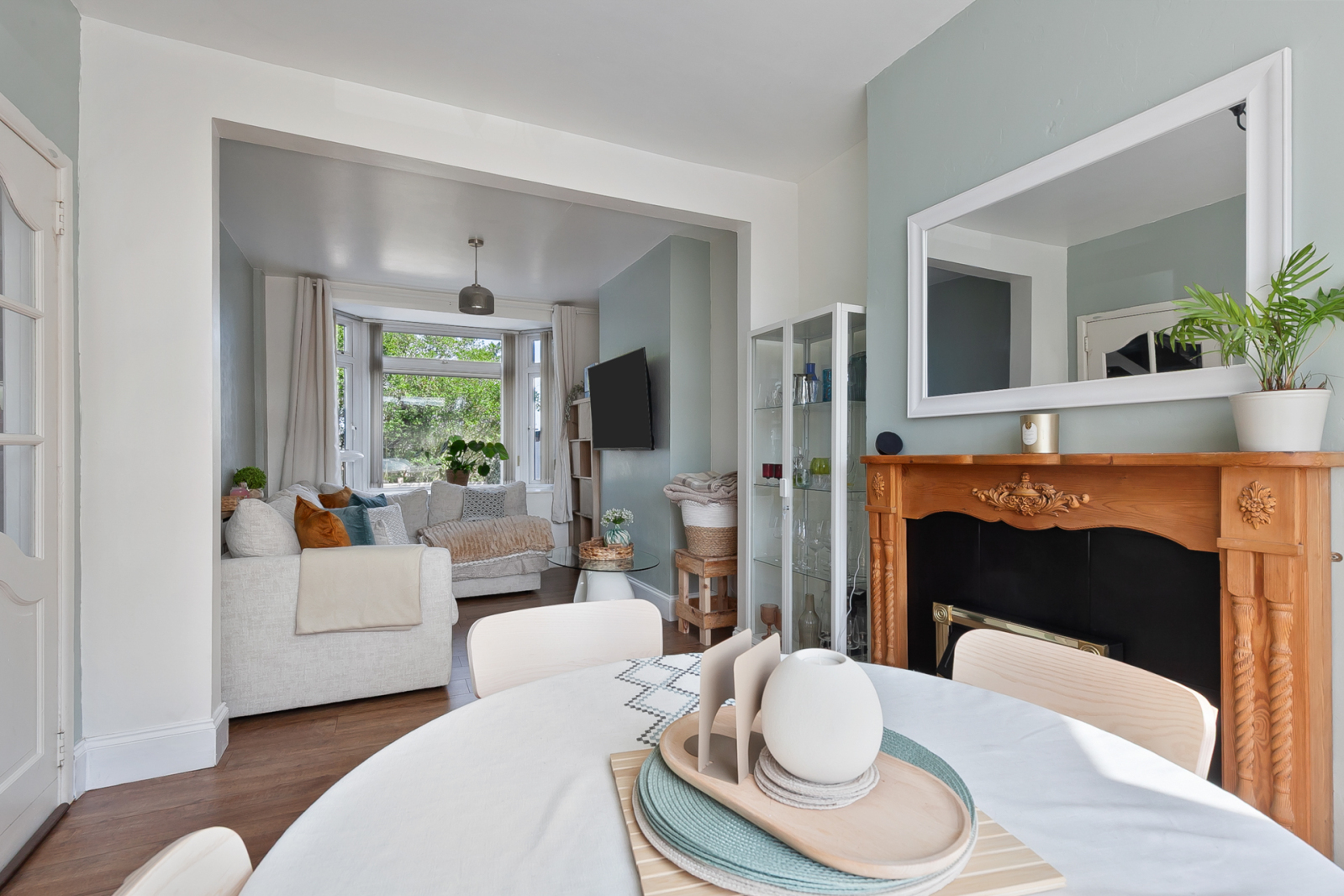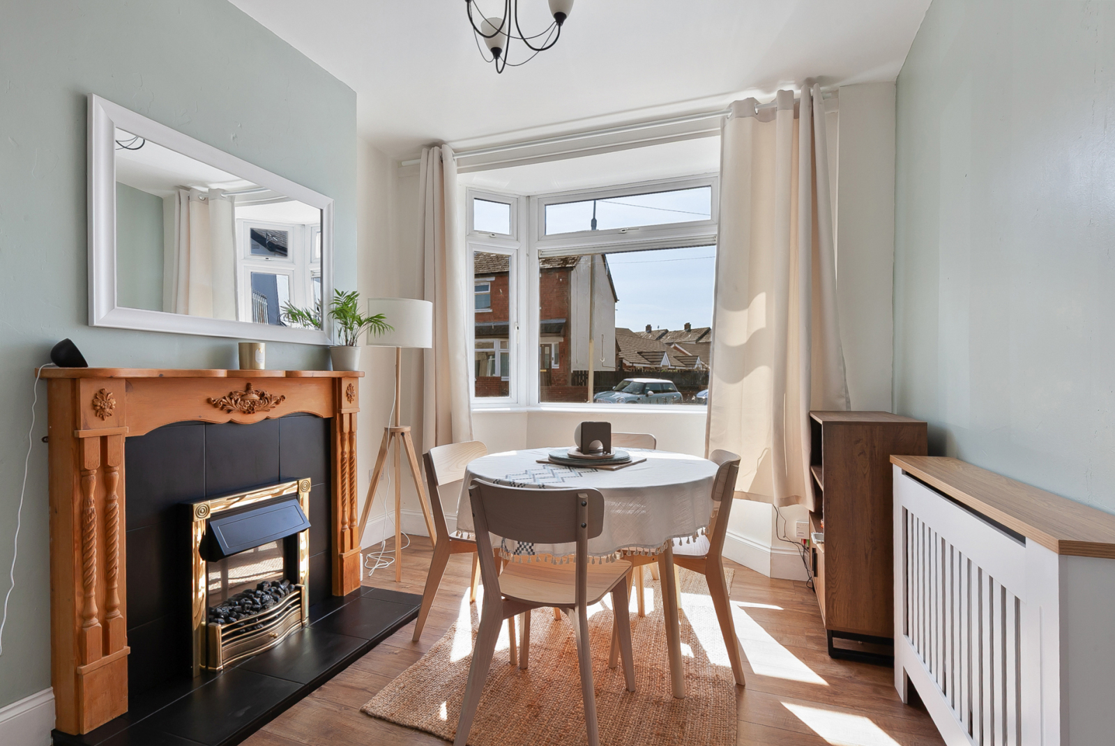 Dual aspect lighting via two bay windows and laminate wood floor.
