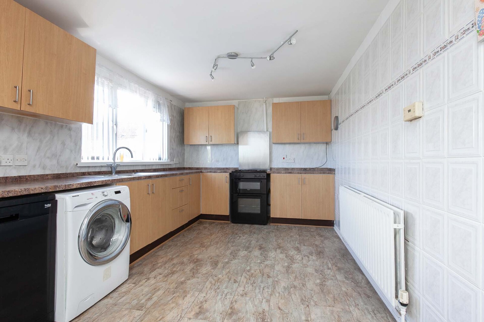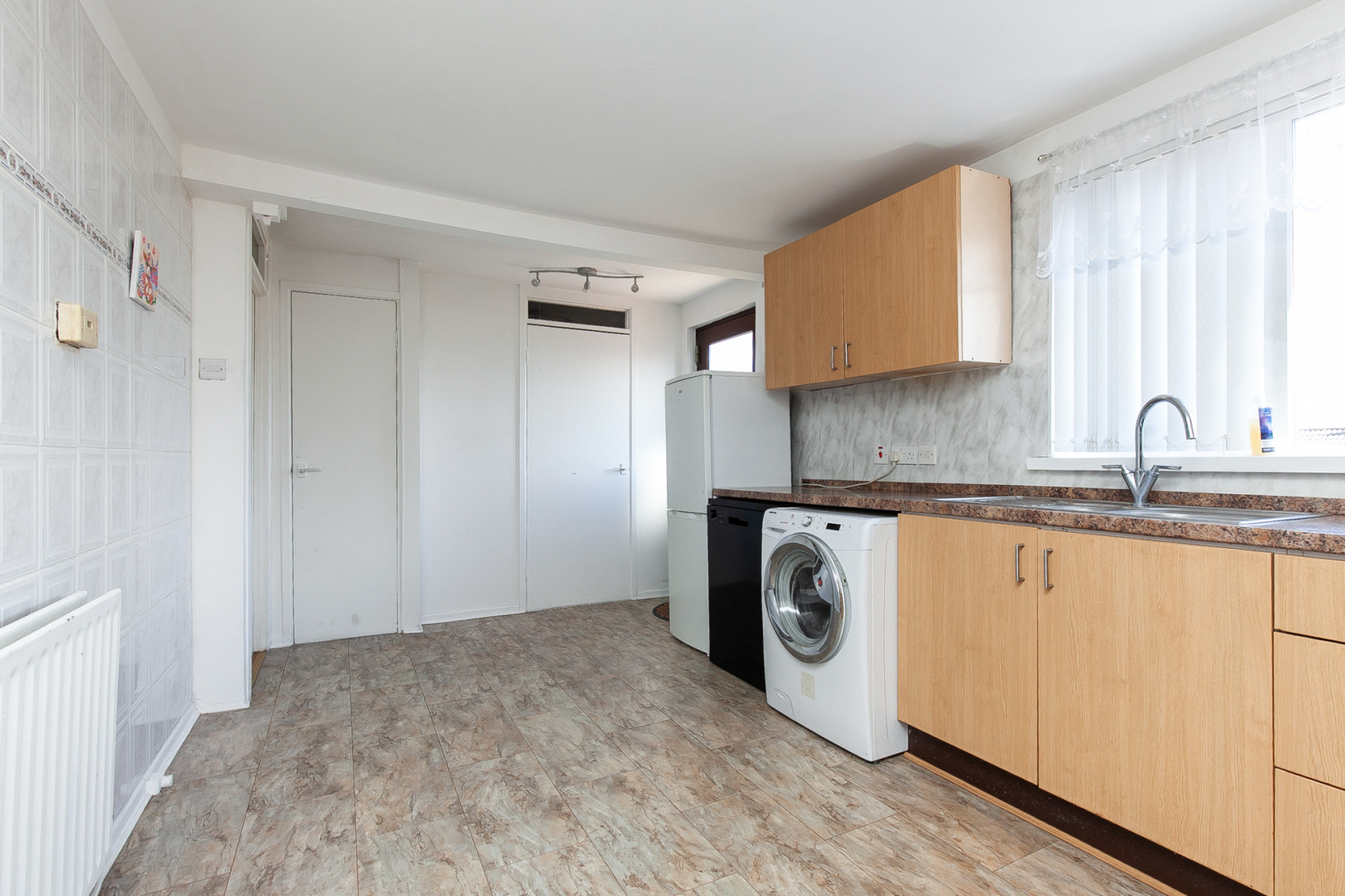 Comprises of high and low level units with 1.5 bowl sink unit with mixer tap and drainer. Space for free standing oven and four ring gas hob with stainless steel splash back. Plumbed for washing machine, plumbed for dishwasher, space for fridge and freezer, partly tiled walls, space for dining, excellent storage and access to rear garden.
