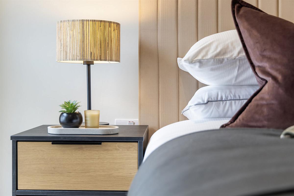 The apartments are fully furnished with contemporary furniture and finished in a sophisticated neutral colour palette with luxury flooring throughout. Bedrooms are generously sized and include sliding mirrored wardrobes, while the bathrooms are finished to a high standard with either double walk-in shower units or chrome shower over bath.