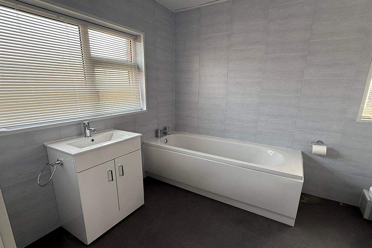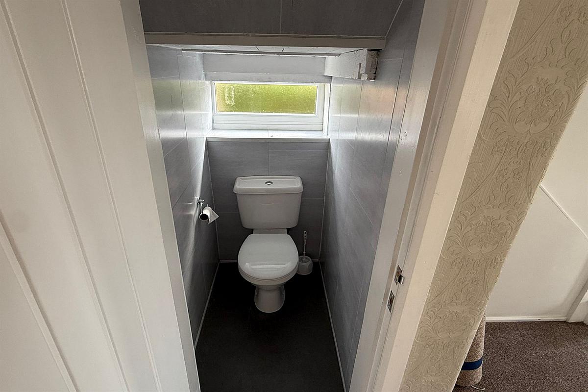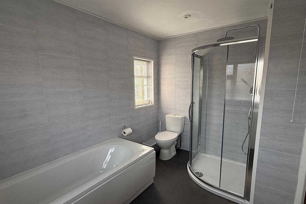 Accommodation comprises three well-proportioned bedrooms and a newly refurbished family bathroom, which boasts a corner shower cubicle, separate bath, and a wash hand basin set within a vanity unit, all complemented by contemporary grey PVC paneling. Additionally, there is a convenient downstairs w/c.