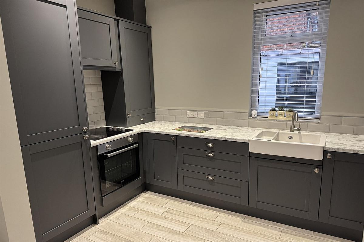 The kitchen features built in modern conveniences including Fridge Freezer, oven and cooktop with attractive subway tile back splash, Farmhouse style sink and a utility area with seperate, high spec washing machine and dryer.