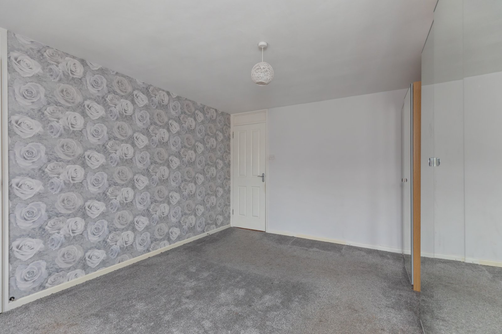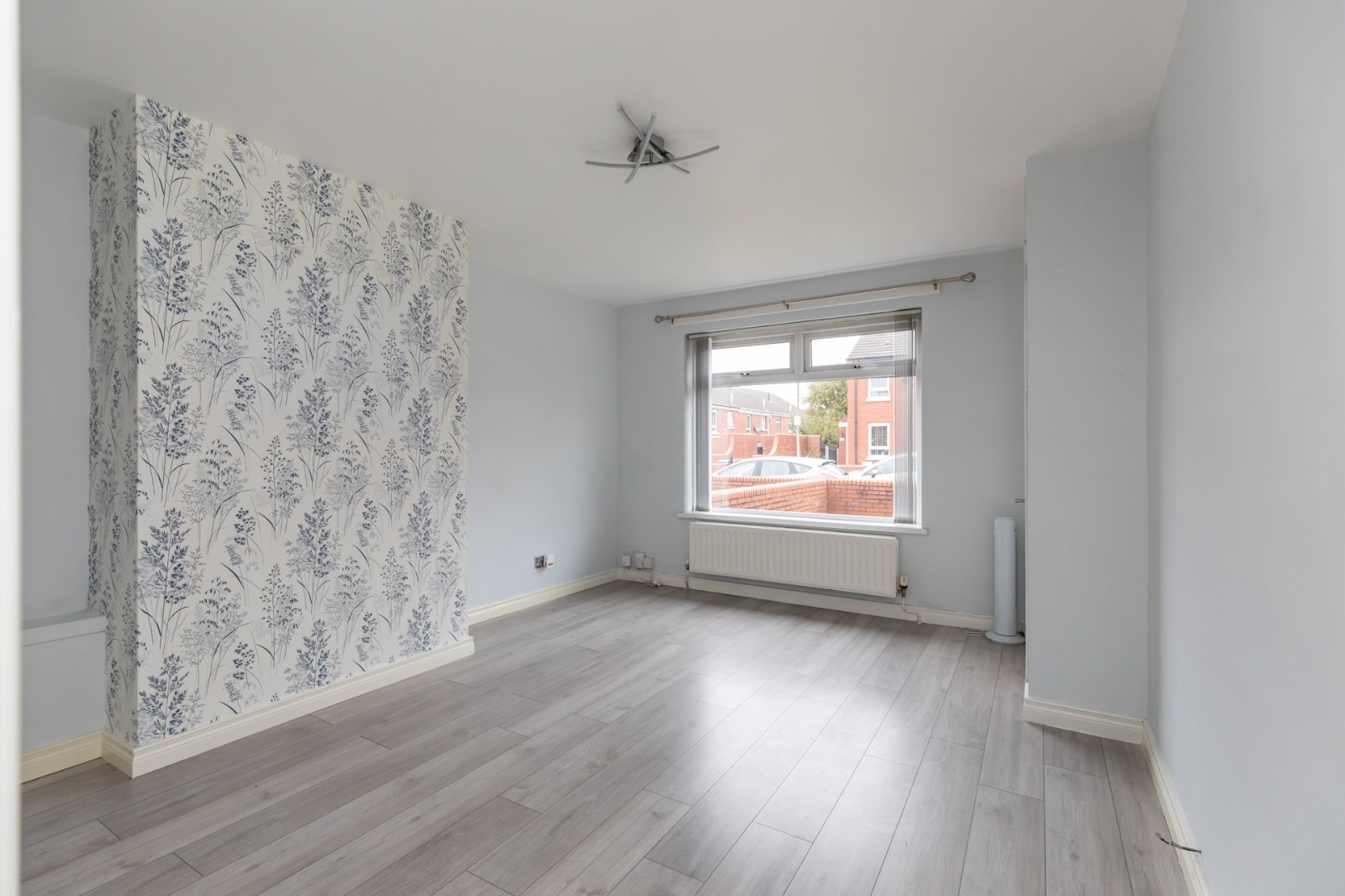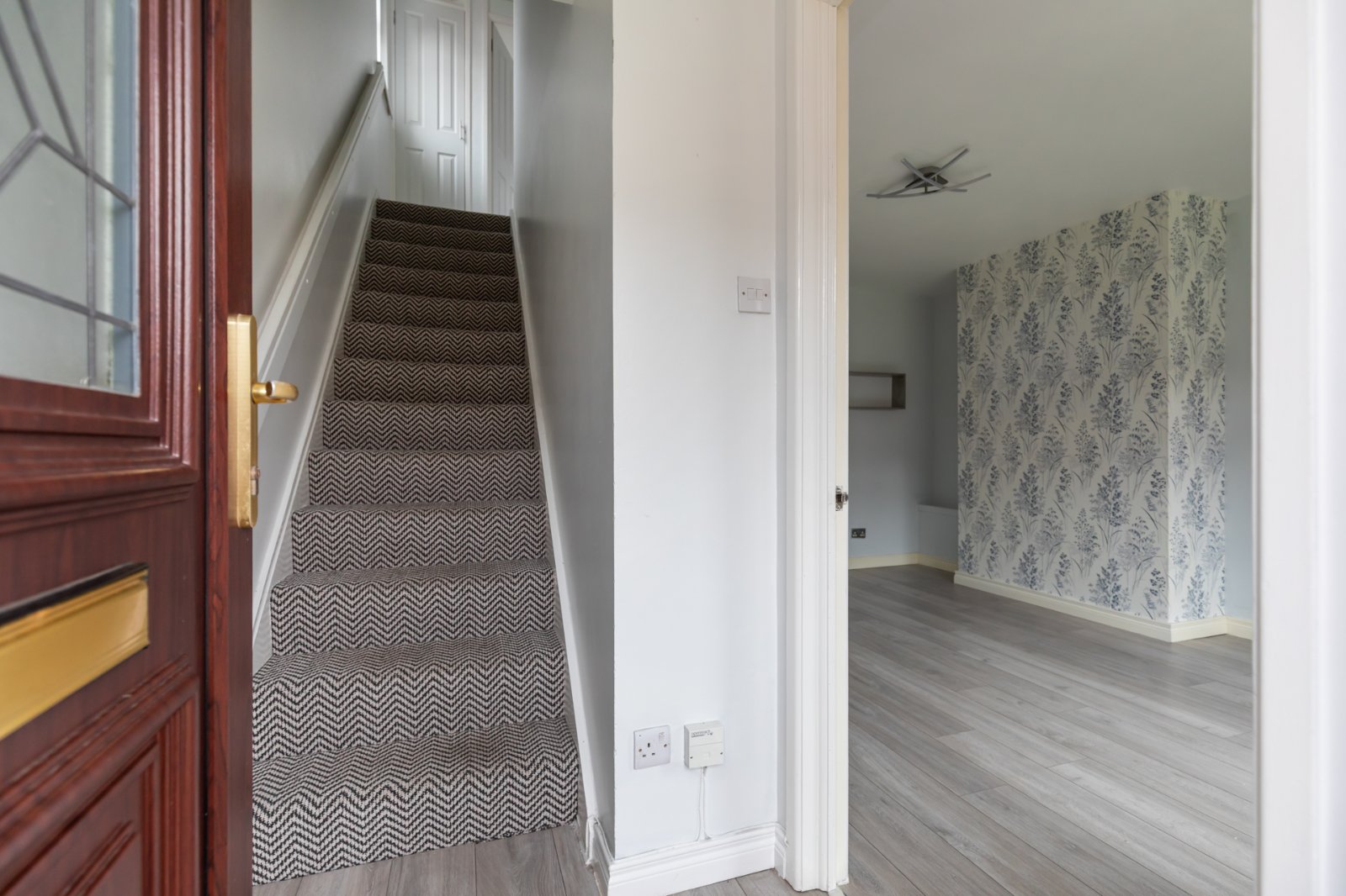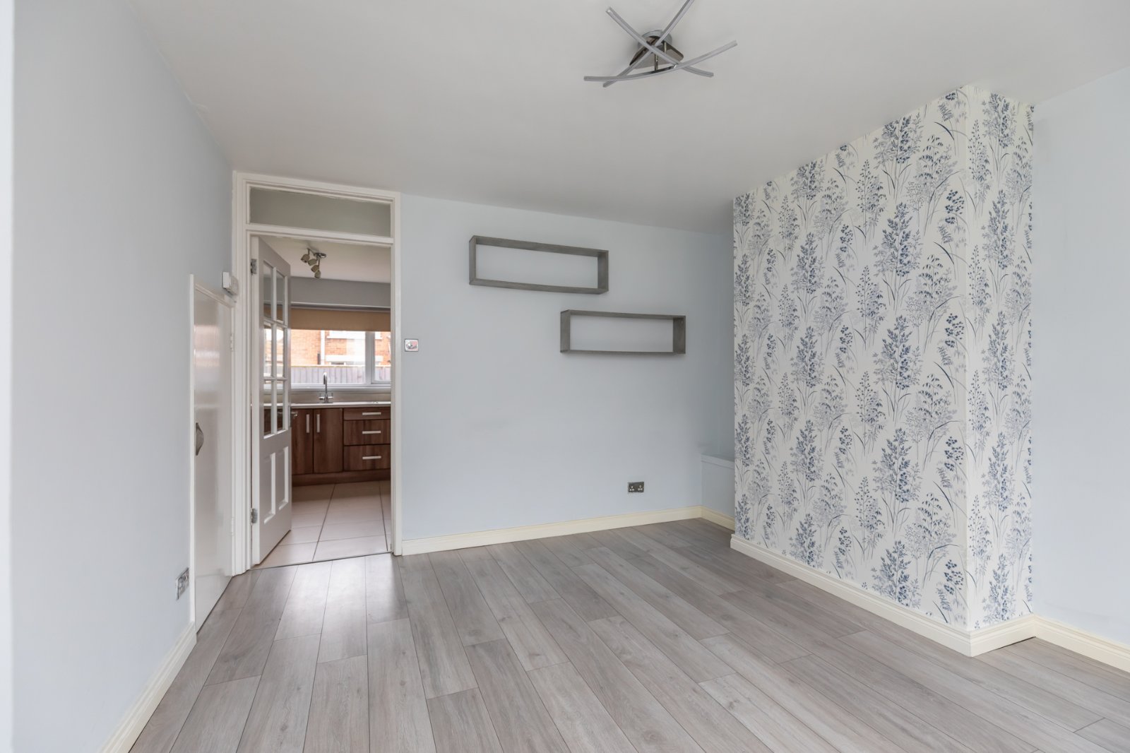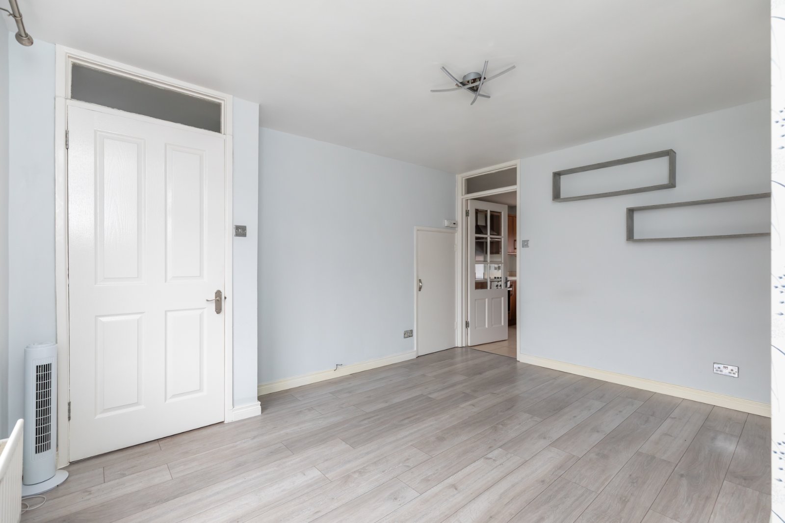 Laminate wood effect flooring, electrics cupboard, access to living room.