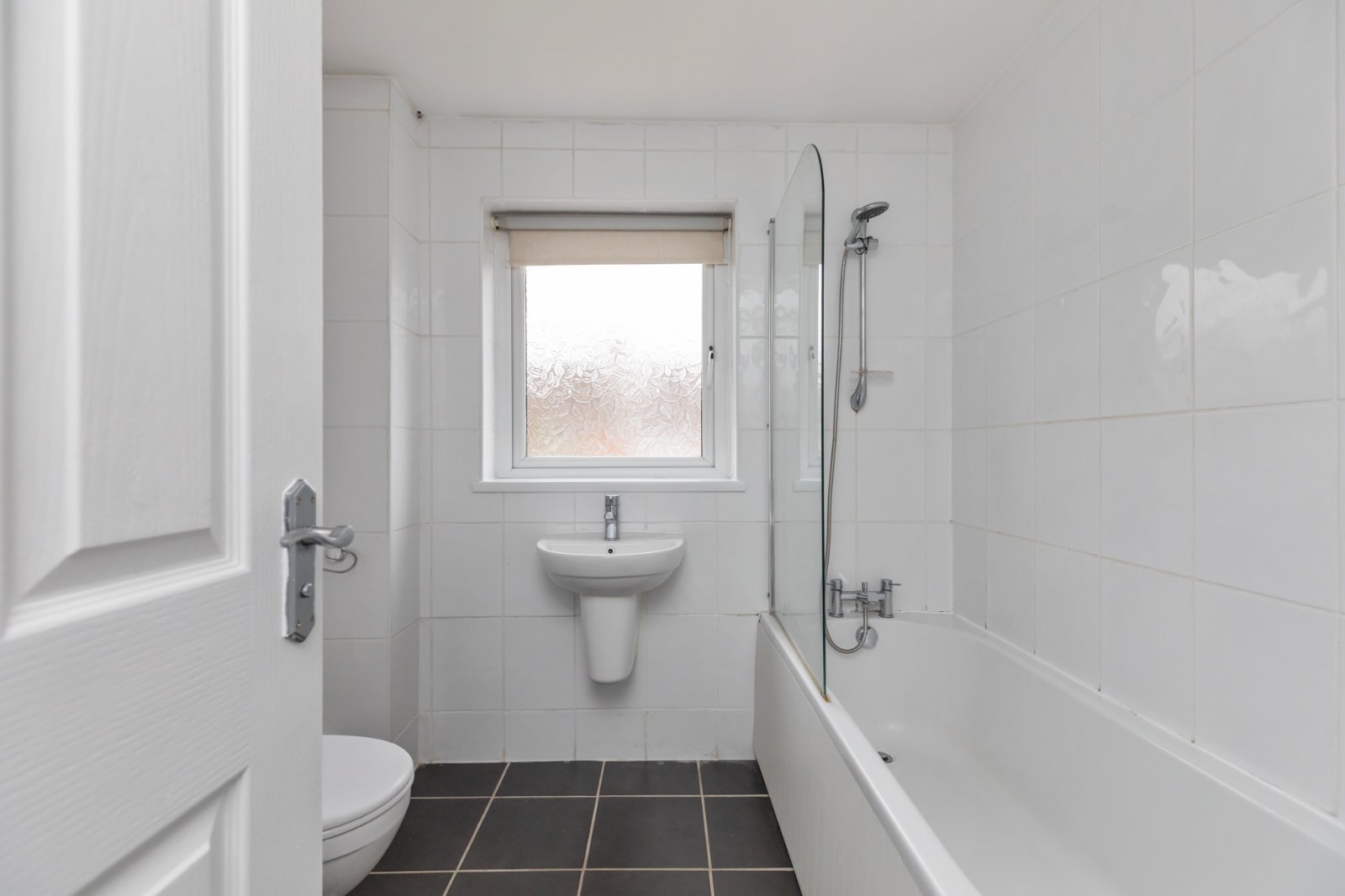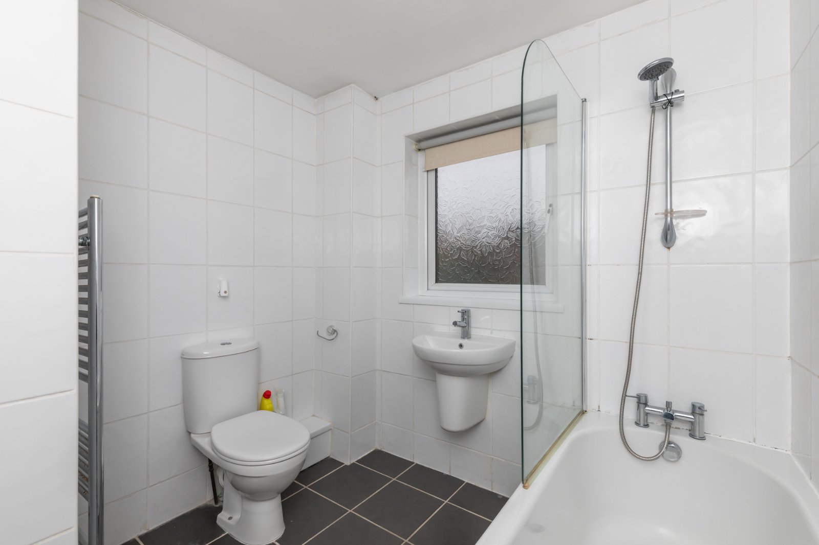 White suite comprising of low flush WC, floating wash hand basin with mixer tap, panelled bath with hot and cold tap and handset, fully tiled walls, tiled flooring, vertical chrome heated towel rail.