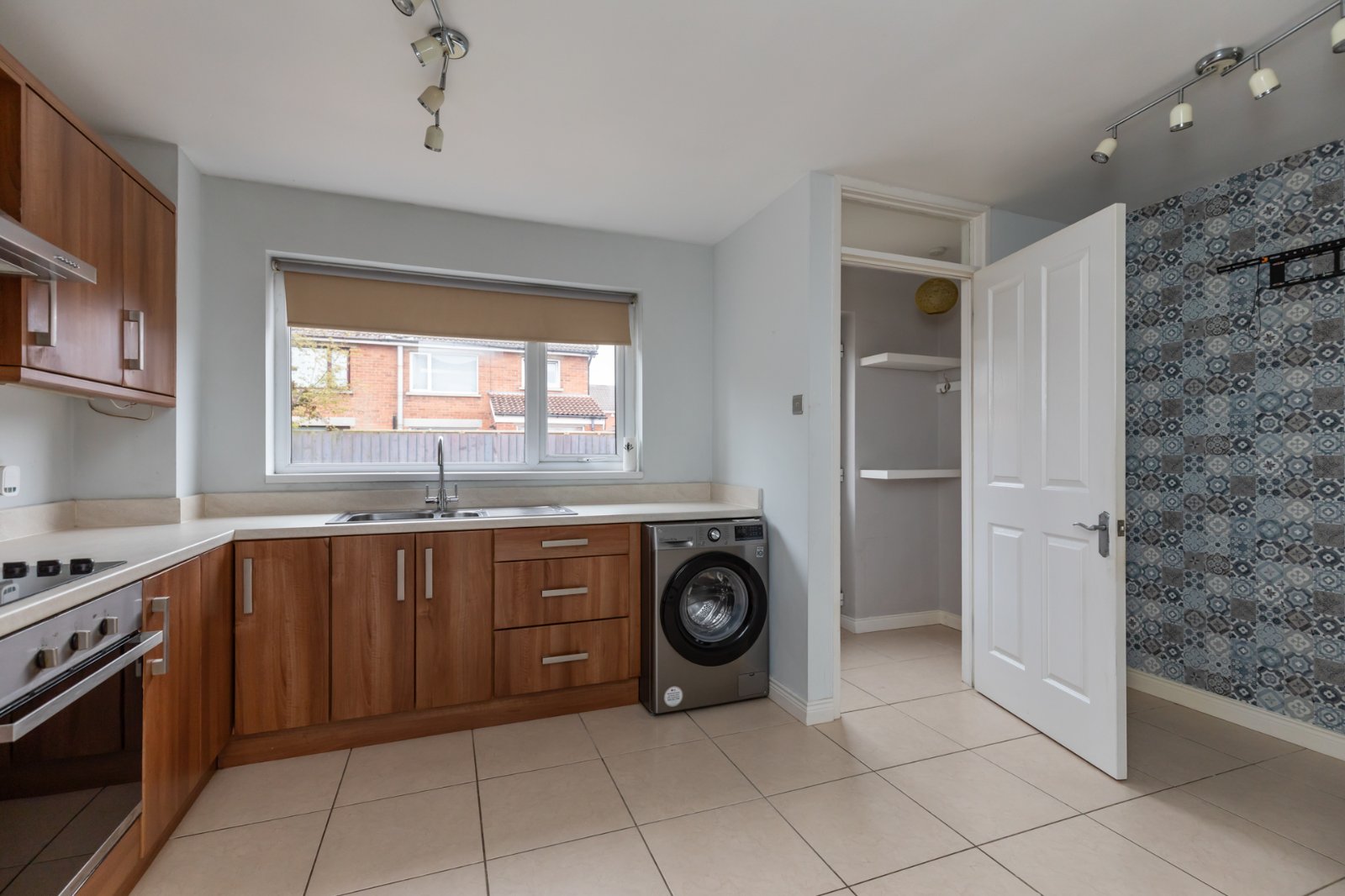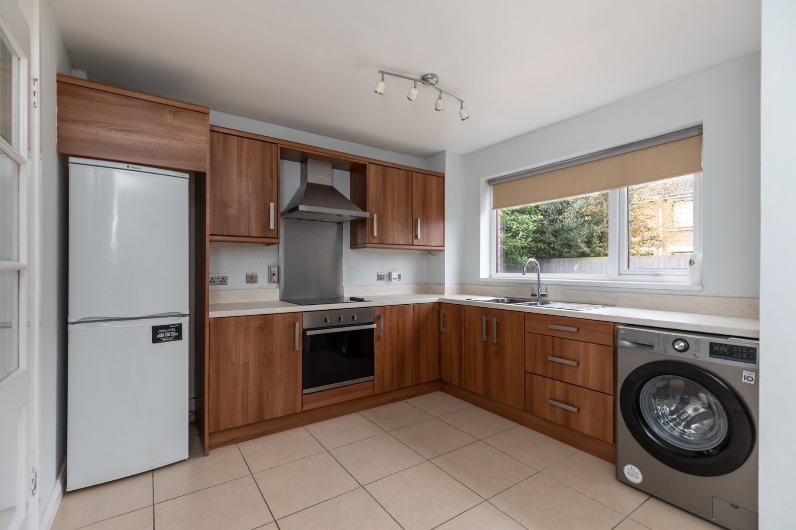 Range of high and low level units, laminate work surface with stainless steel sink unit and drainer, 1.5 tub with mixer tap. Integrated oven, four ring electric hob, stainless steel kitchen splash back with stainless steel extractor above, space for fridge freezer, plumbed for washing machine, space for tumble dryer, tiled flooring, open to dining area, access to rear hall.