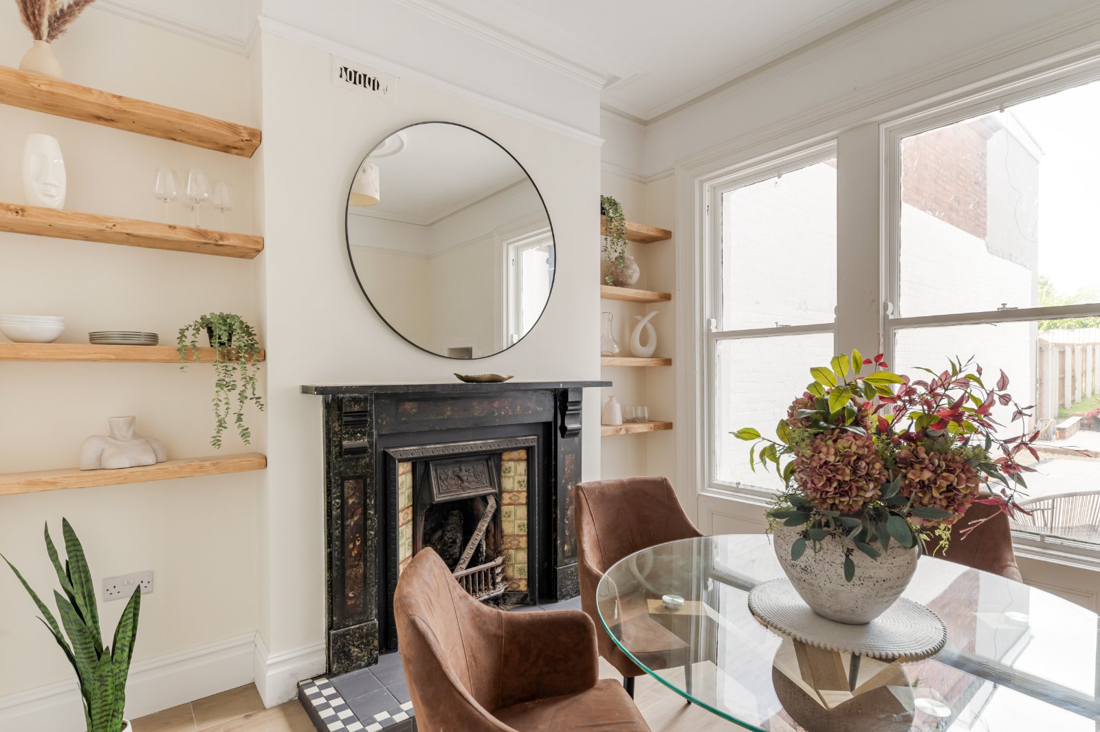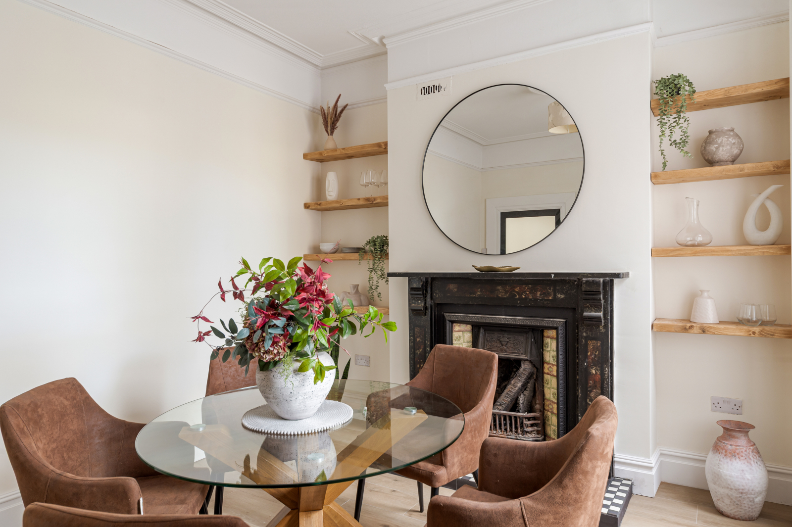 Open feature fireplace - not in use, recessed shelving, cornicing, picture rail, rose ceiling, sliding sash windows, porcelain wood effect tiled flooring.