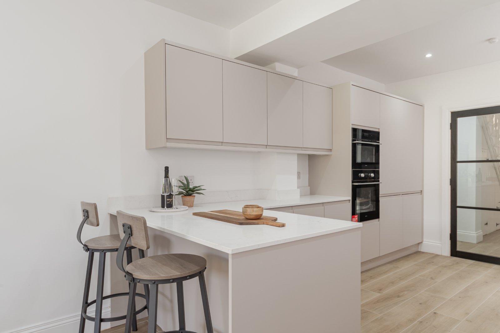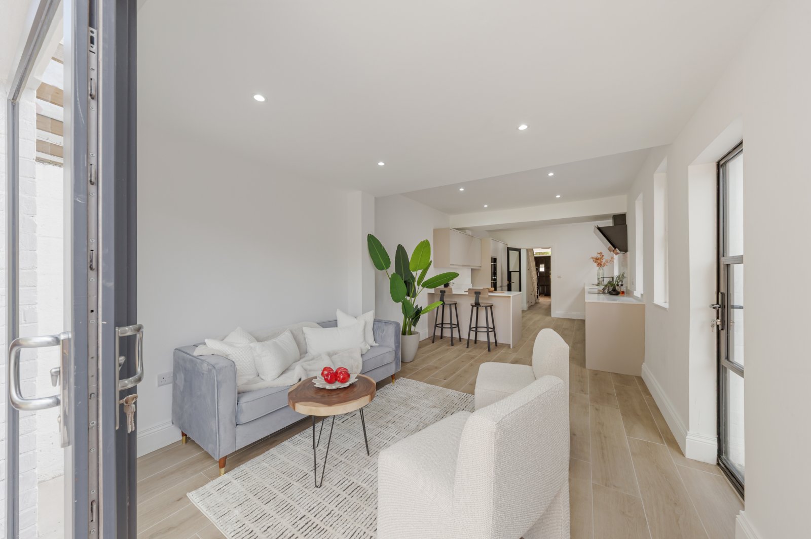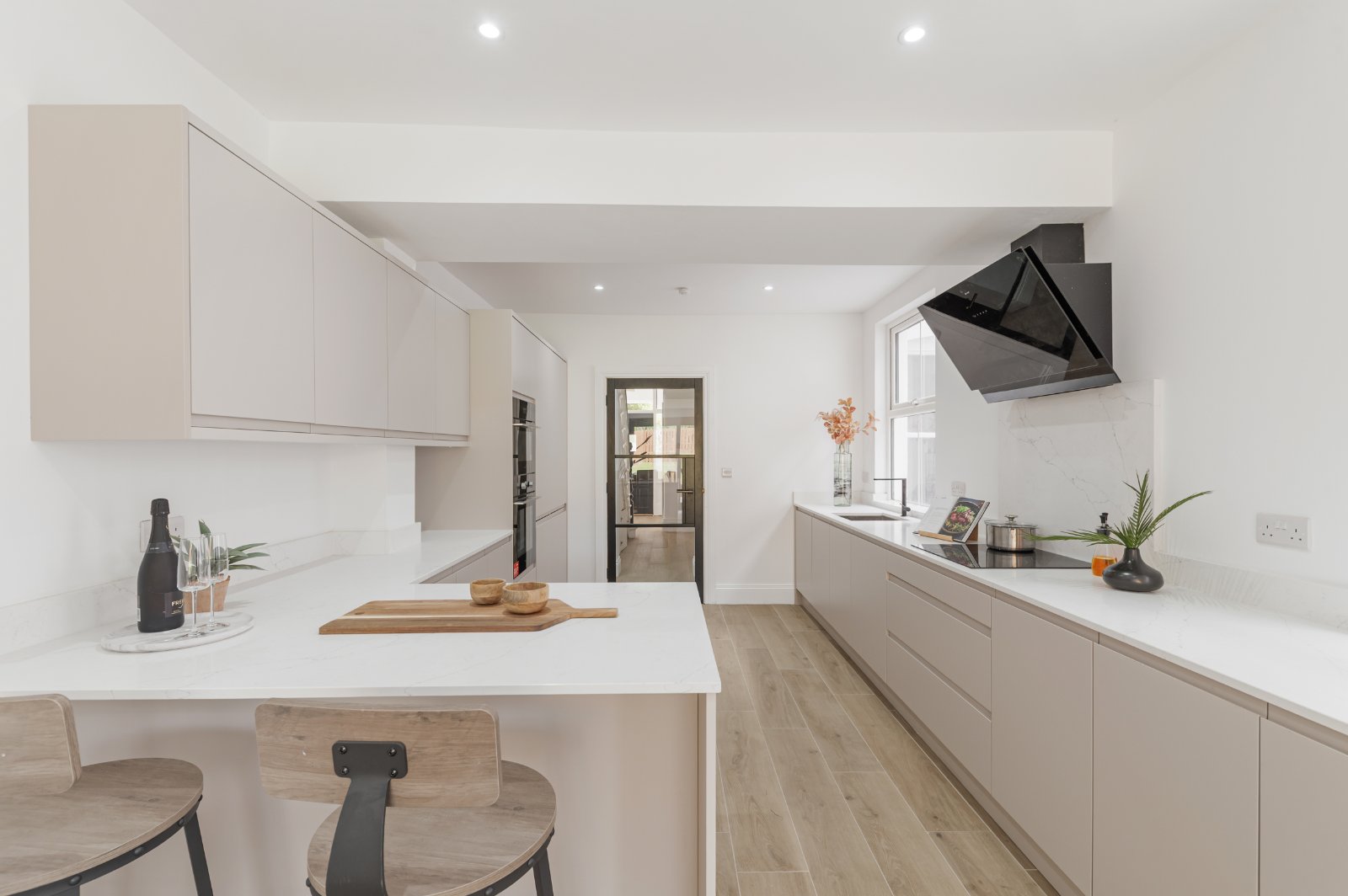 Fantastic range of high and low level units, quartz work surfaces, stainless steel sink unit and drainer, 1 tub with mixer tap, integrated oven, integrated microwave / grill, integrated fridge freezer, four ring induction hob with extractor fan above, quartz kitchen splash back, integrated dishwasher, integrated wash dryer, porcelain wood effect flooring, recessed spotlighting, breakfast bar for casual dining, open to living / dining area with porcelain wood effect tiled flooring, recessed spotlighting, sliding door leading through to rear garden.