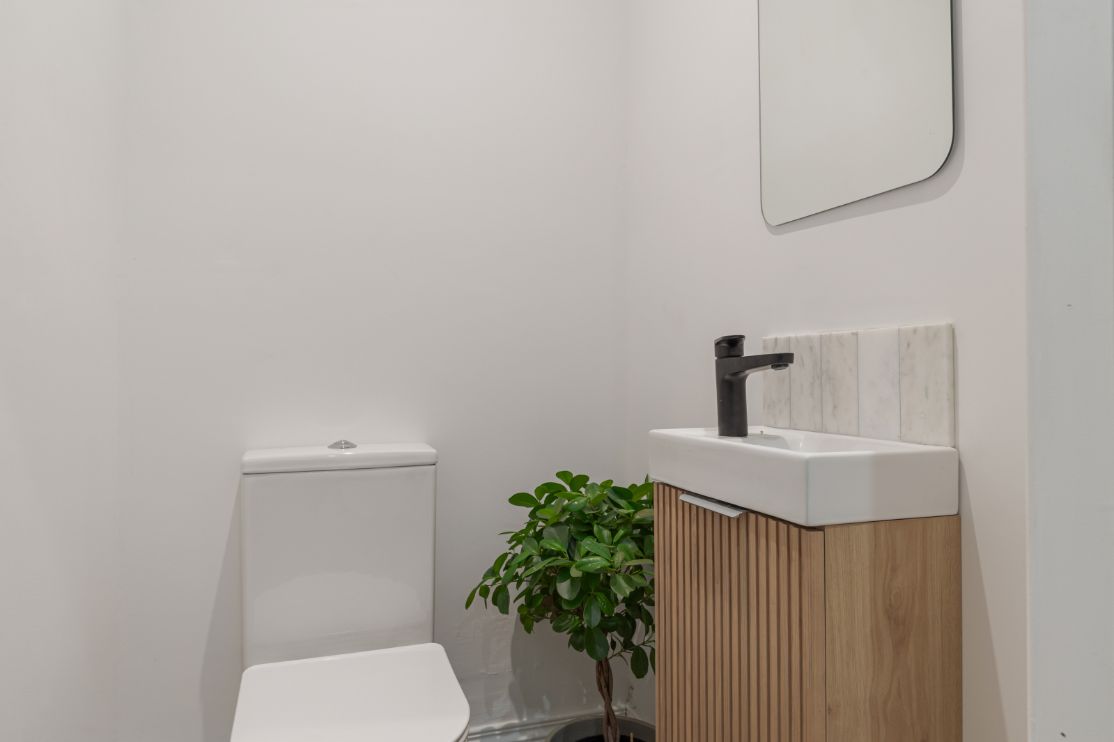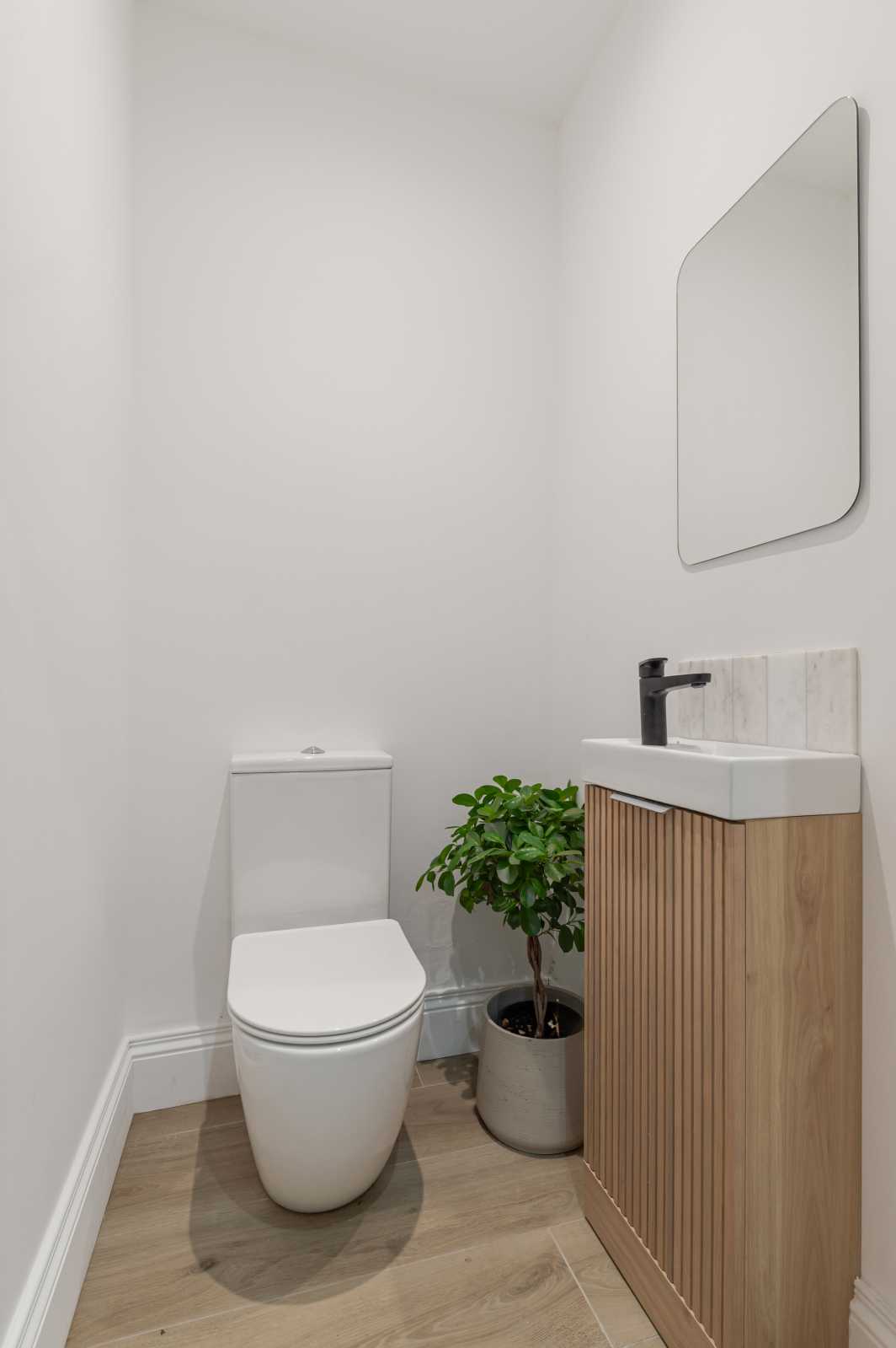 White suite comprising of low flush WC, wash hand basin with mixer tap, storage below, marble splash back, porcelain wood effect tiled flooring, recessed spotlighting.