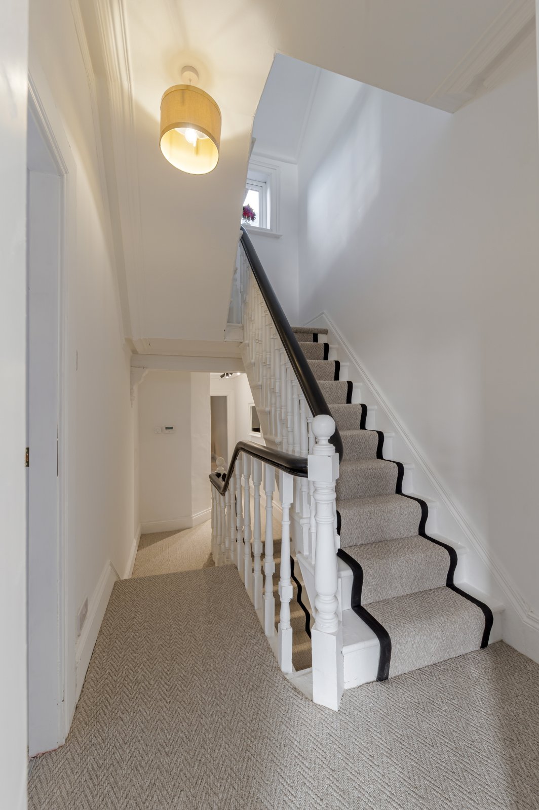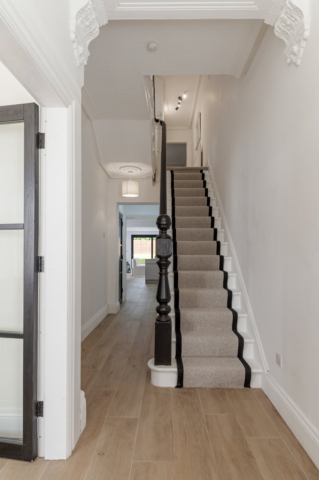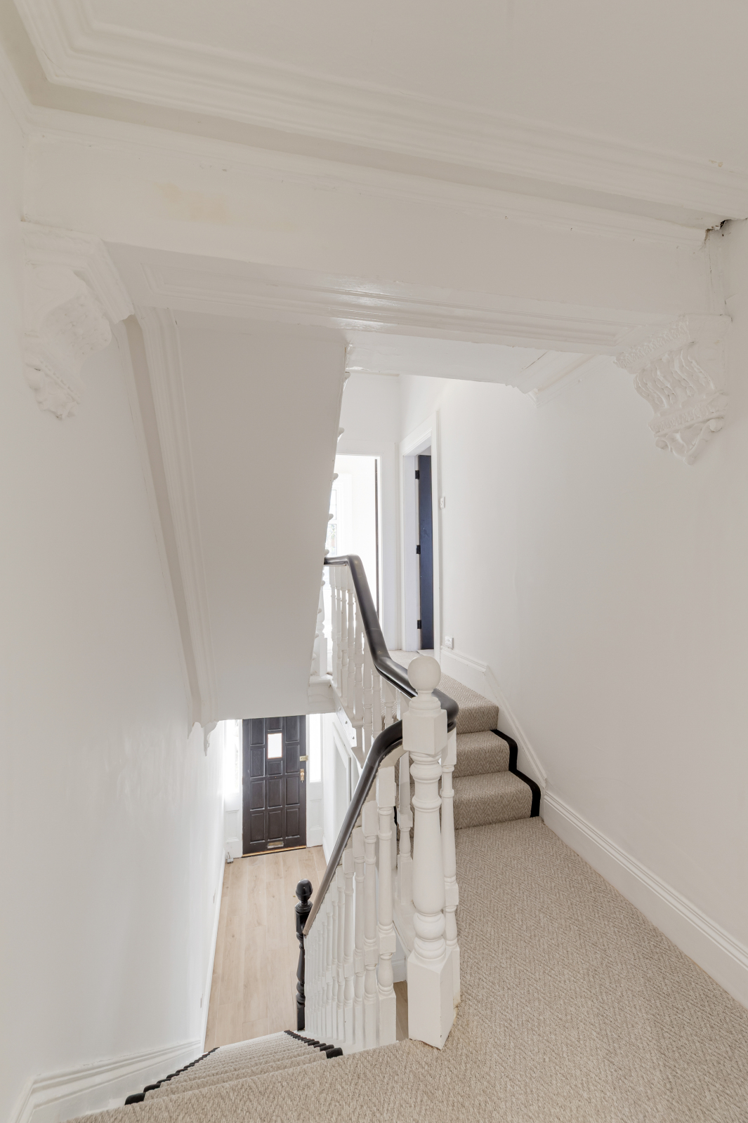 Cornice ceiling, rose ceiling, porcelain wood effect tiles, storage below stairs.