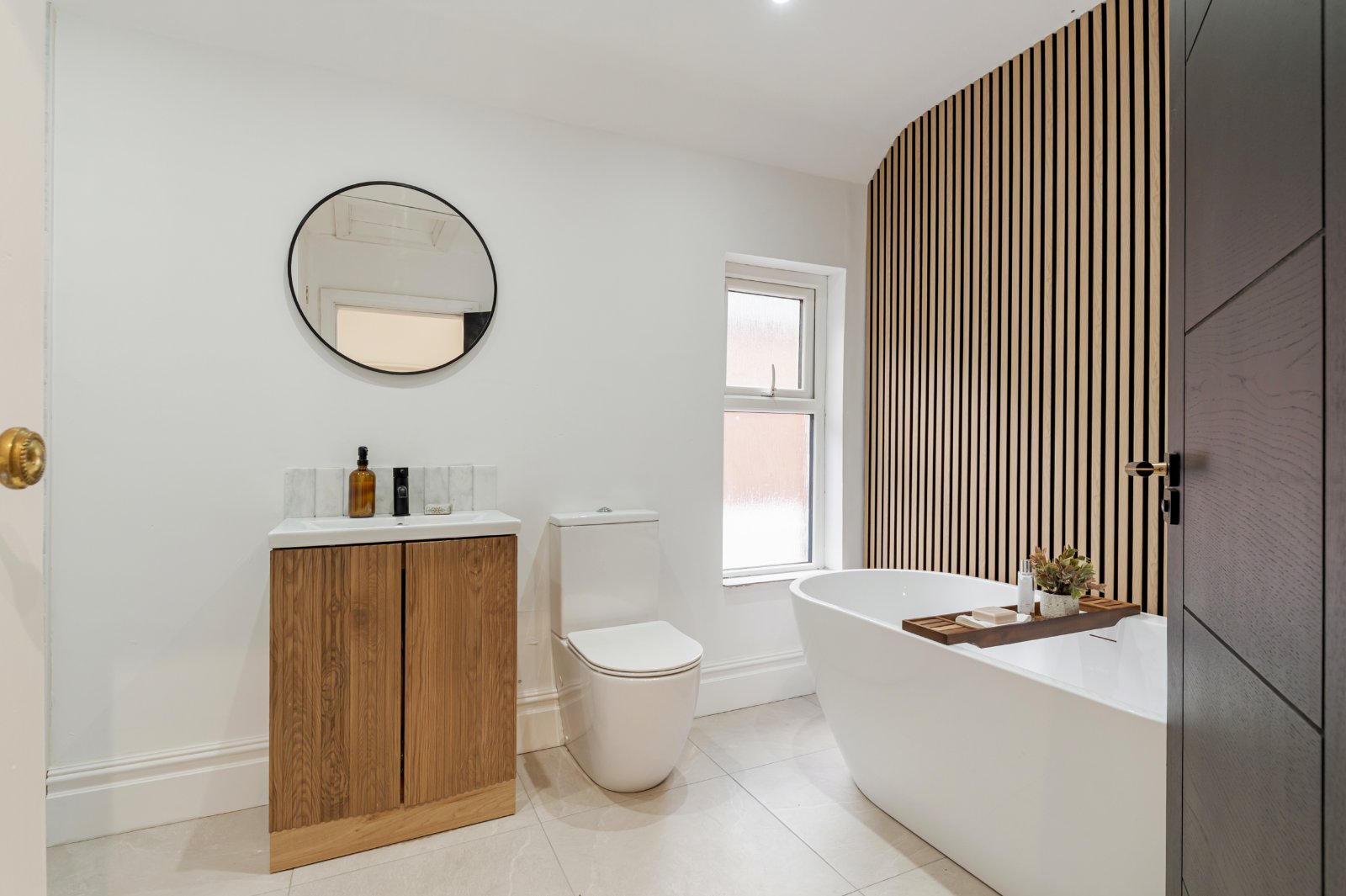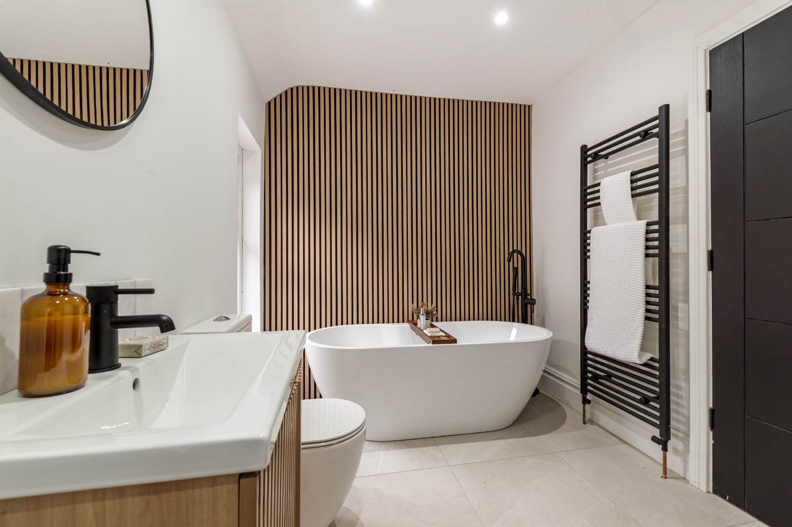 White suite comprising of low flush WC, wash hand basin, mixer tap, marble tiled splash back, storage below, standalone bath with handset and swan neck mixer tap, walk-in thermostatically controlled shower with handset and rainfall shower head, partly marble tiled walls, tiled flooring, wooden paneling, recessed spotlighting, extractor fan, vertical heated towel rail, cupboard with gas fired central heating boiler.