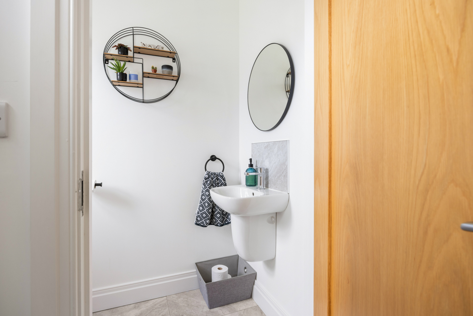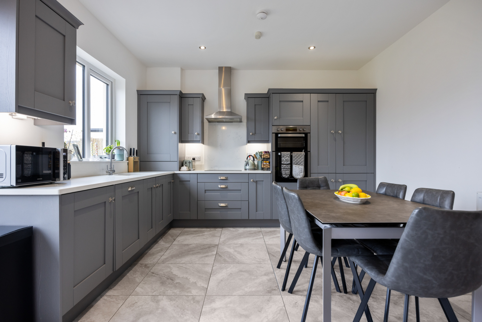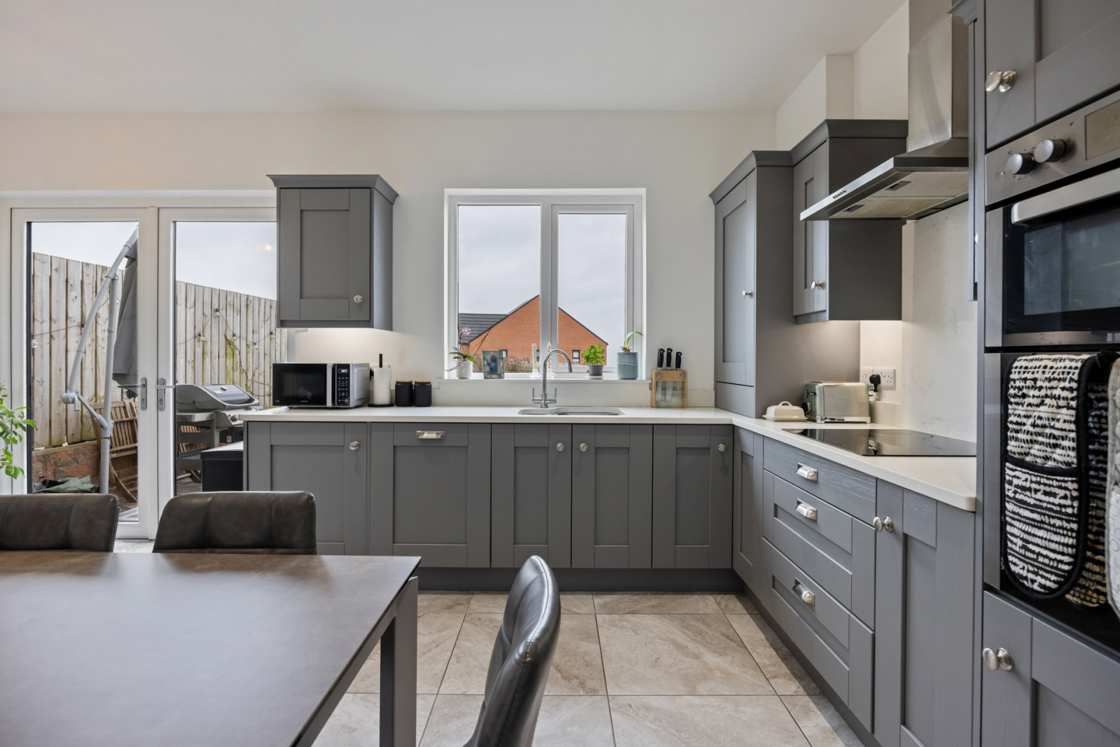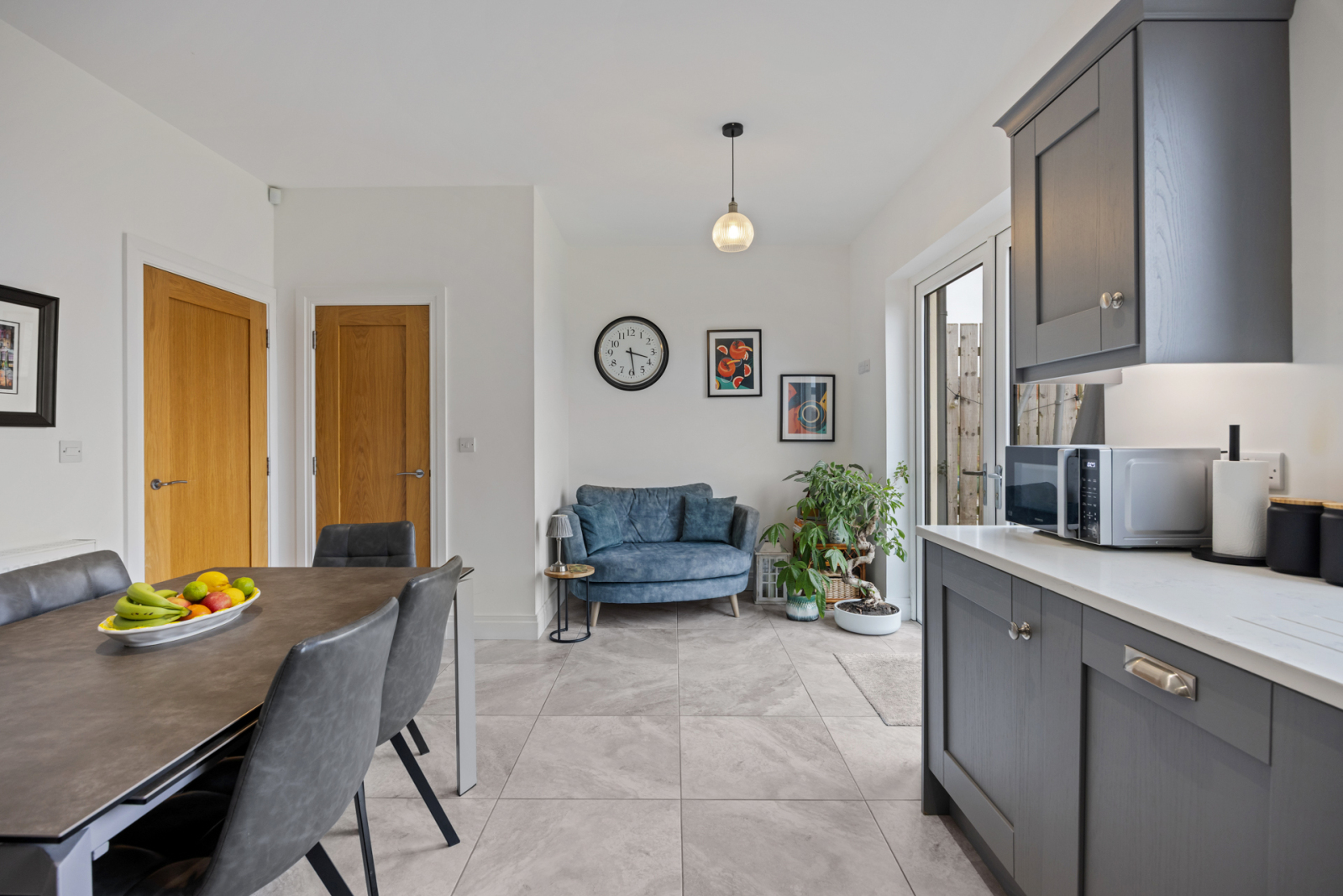 The ground floor comprises a bright and welcoming living room, perfect for relaxing or entertaining. To the rear, a beautifully designed fitted kitchen serves as the heart of the home, complete with quartz worktops, integrated appliances, and a casual dining area that overlooks the garden. A practical downstairs cloakroom with WC adds further convenience.