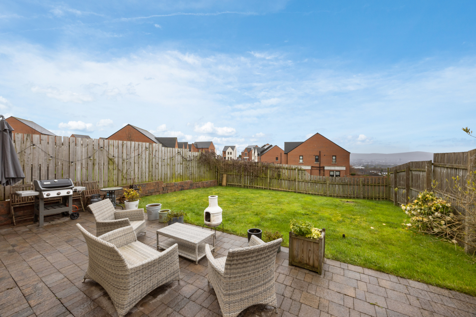 Driveway for two cars. Paved patio with southerly aspect in lawns and patio.