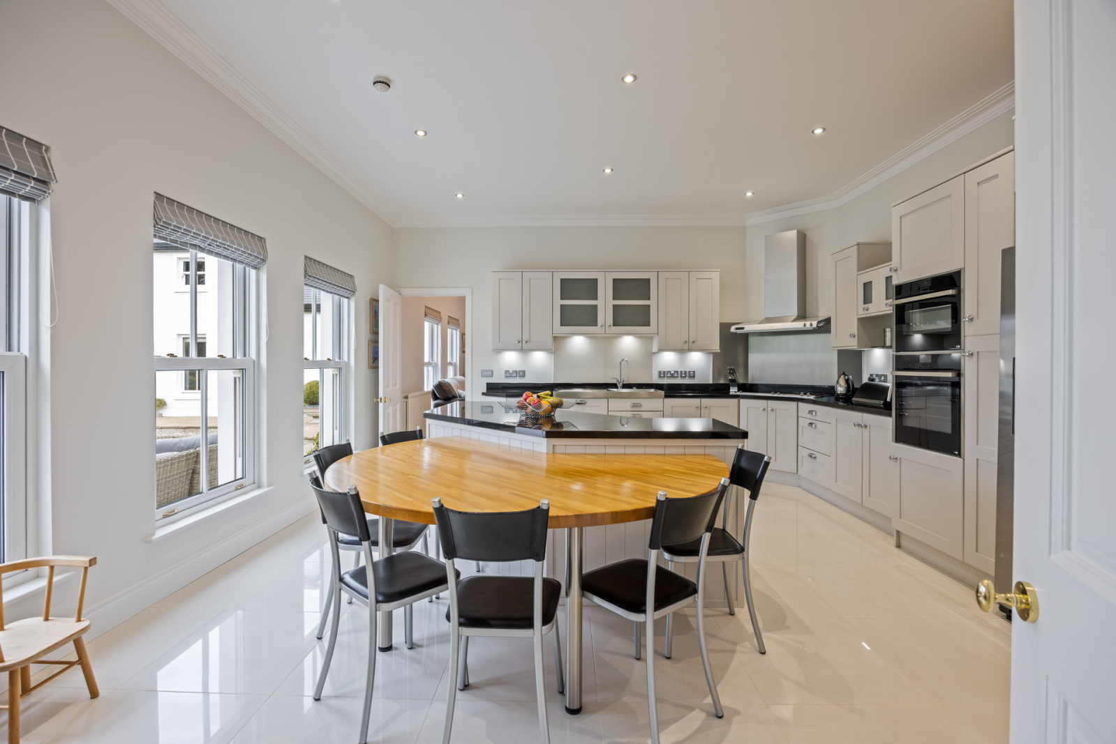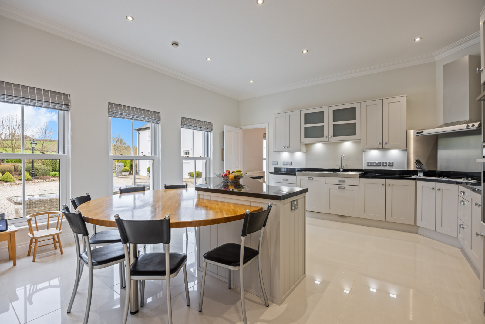 Full range of high and low level units, polished granite work surfaces, stainless steel 1 1/4 bowl sink unit with mixer taps, Gaggenau 4 ring ceramic hob and 2 ring gas hob, Gaggenau stainless steel extractor hood over, eye level Neff oven and oven microwave, recess for large fridge freezer, built in Neff dishwasher, central island with polished granite work surfaces, integral Neff under oven, oak breakfast bar for 6 people, ceramic tiled floor, views out over countryside.