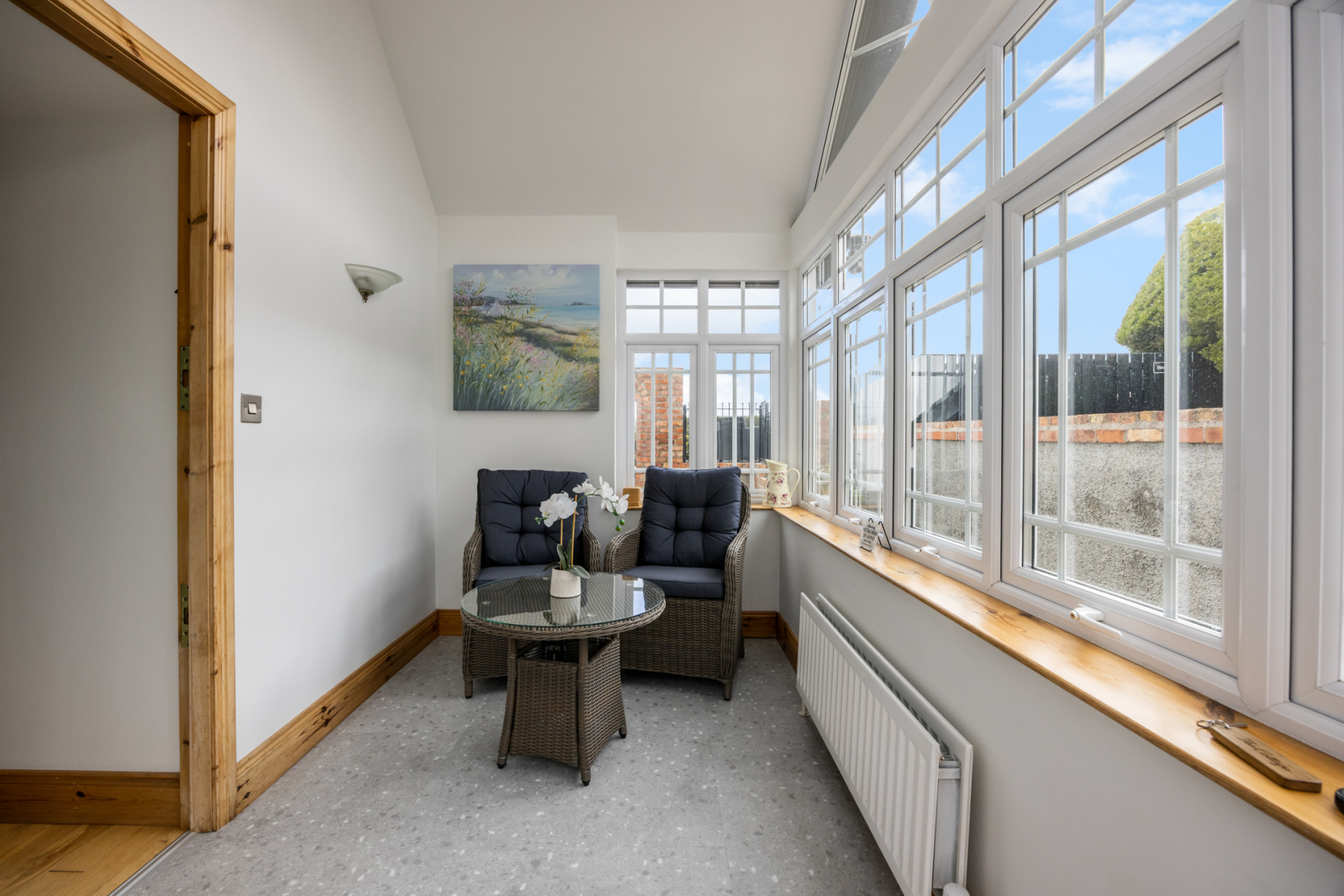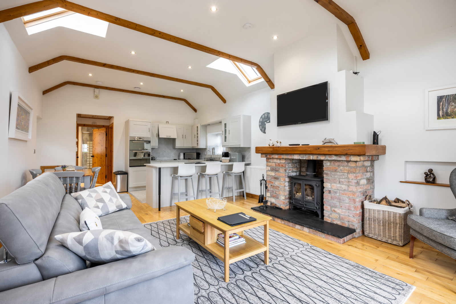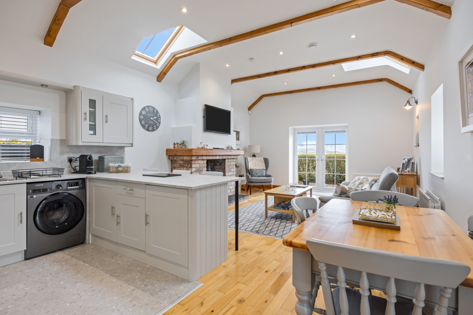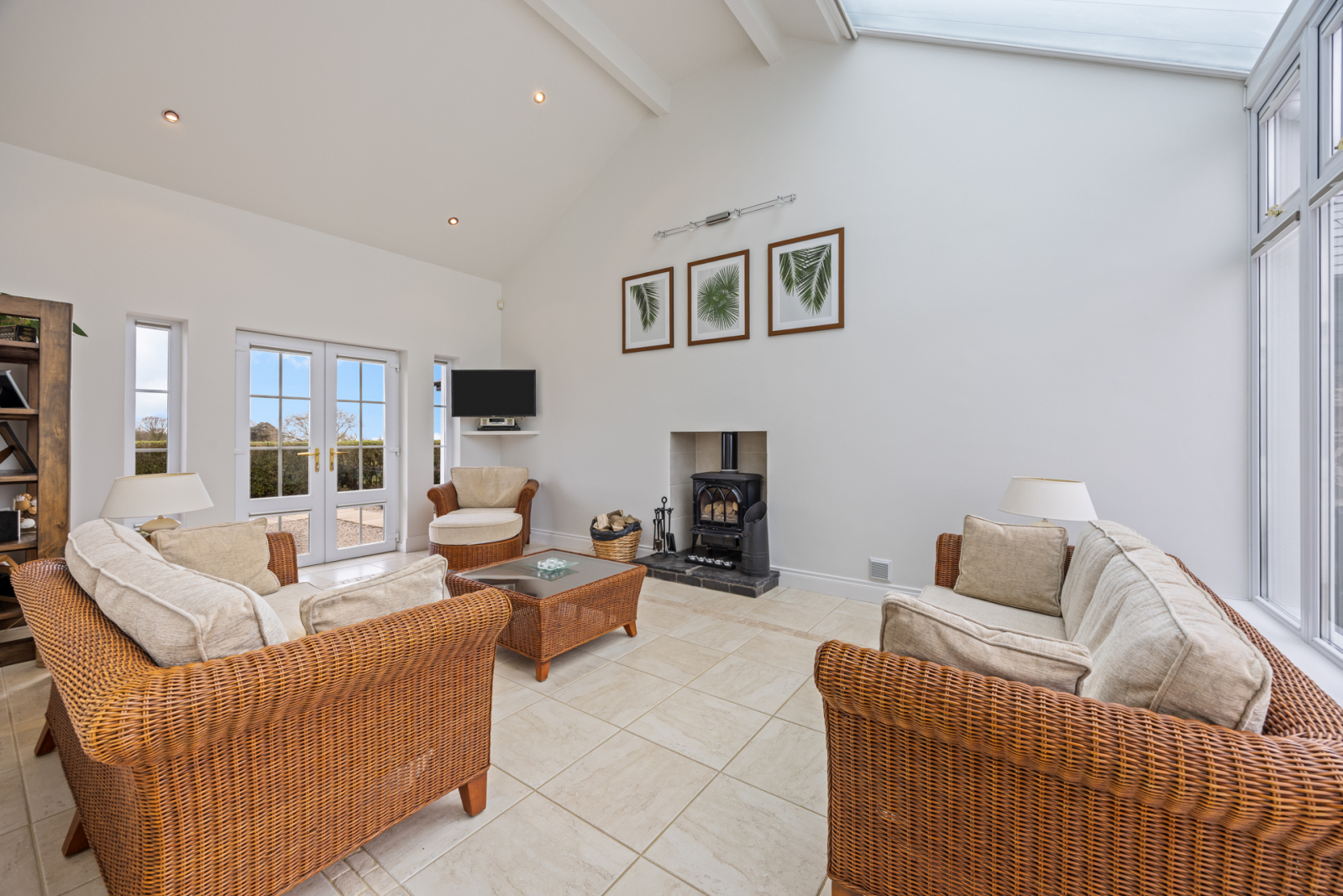 Dual aspect, vaulted ceiling, ceramic tiled floor, Stovax multi fuel stove, Sanderson electric roof blinds, French double doors to front.