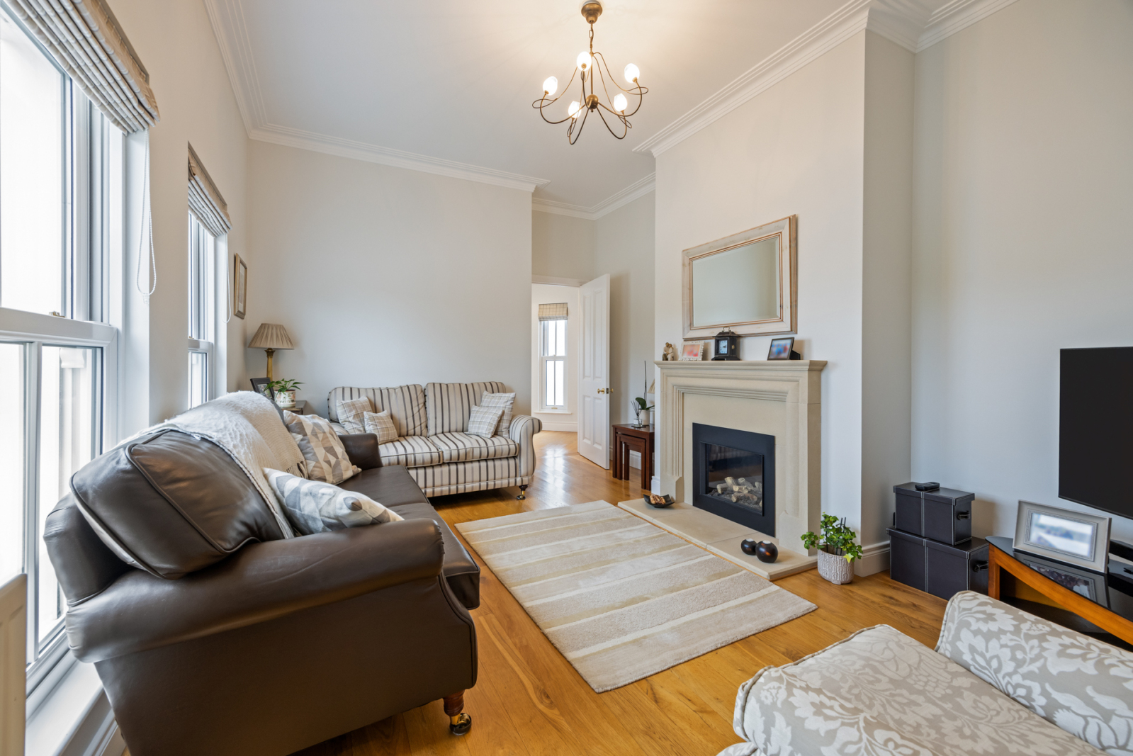 Oak floor, Gazco gas fire, Sandstone surround, corniced ceiling.