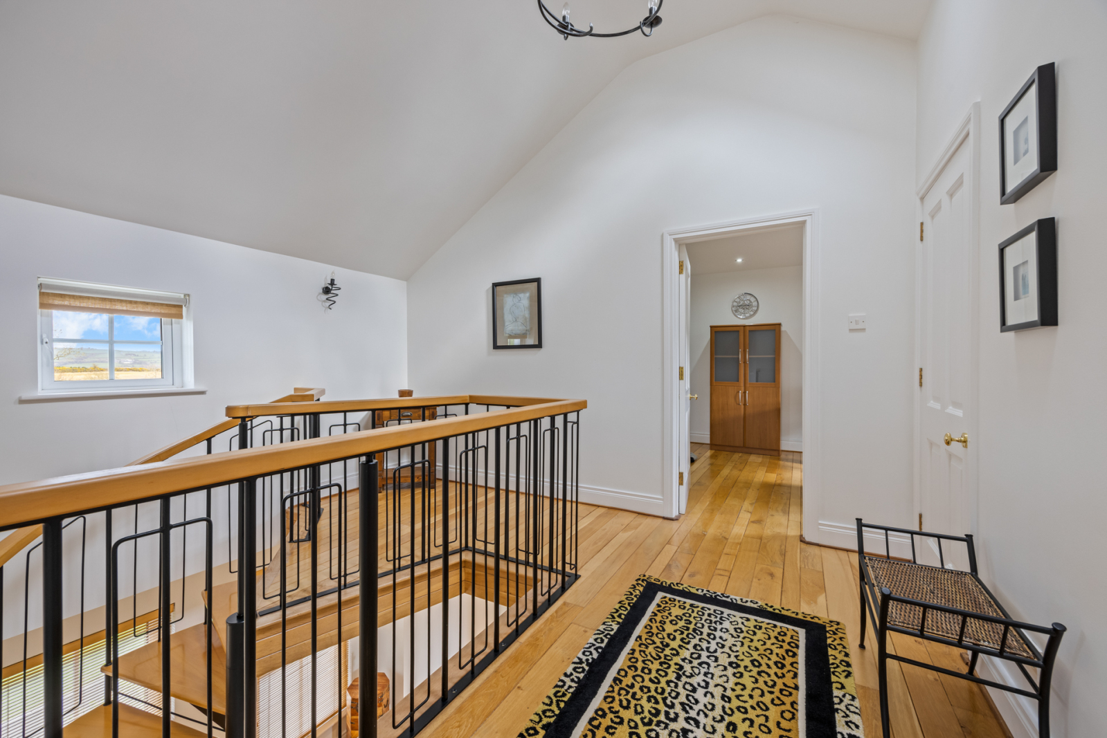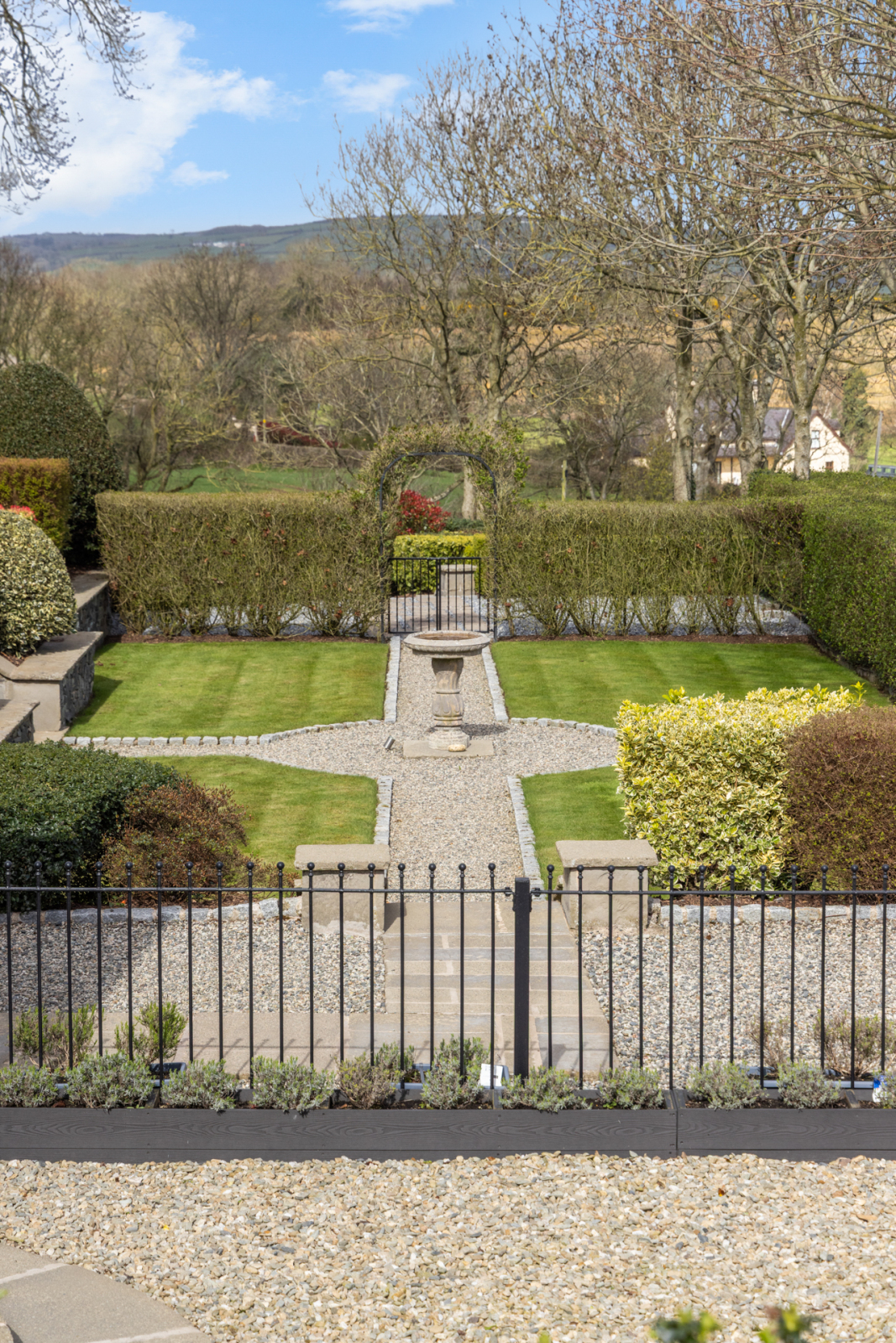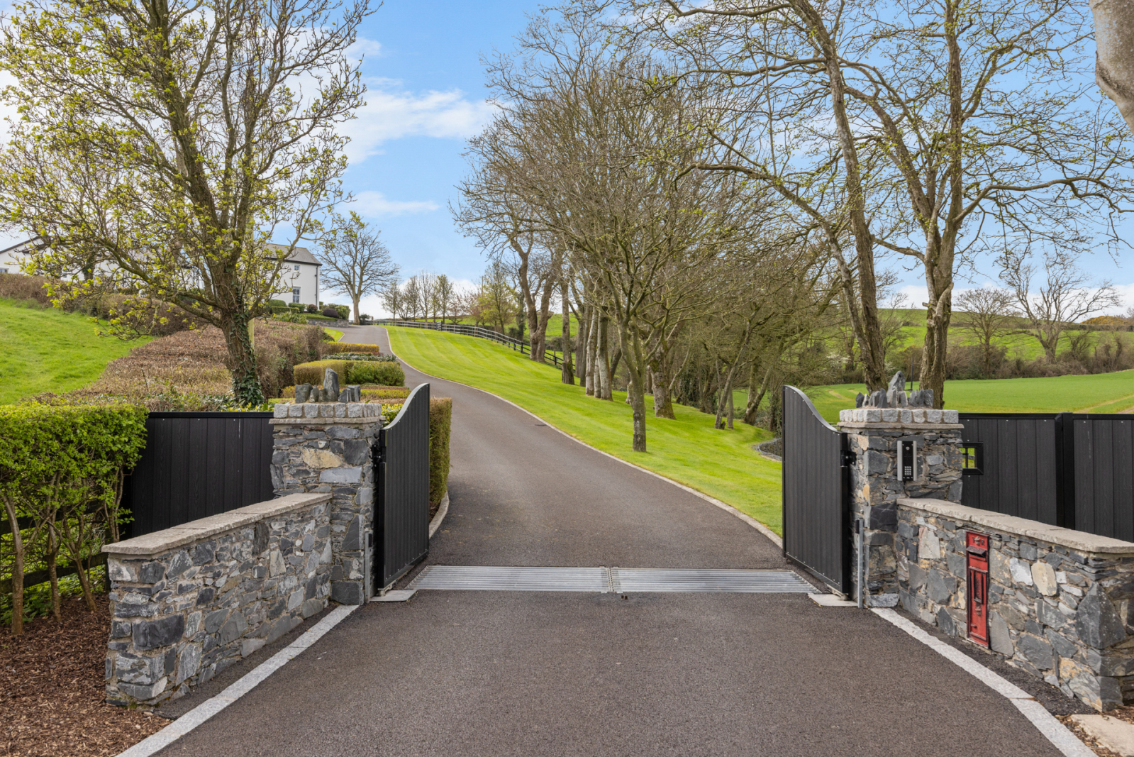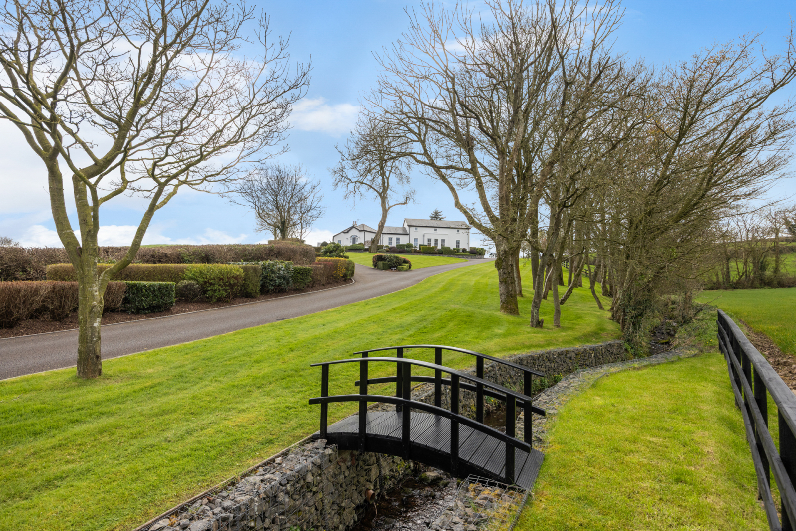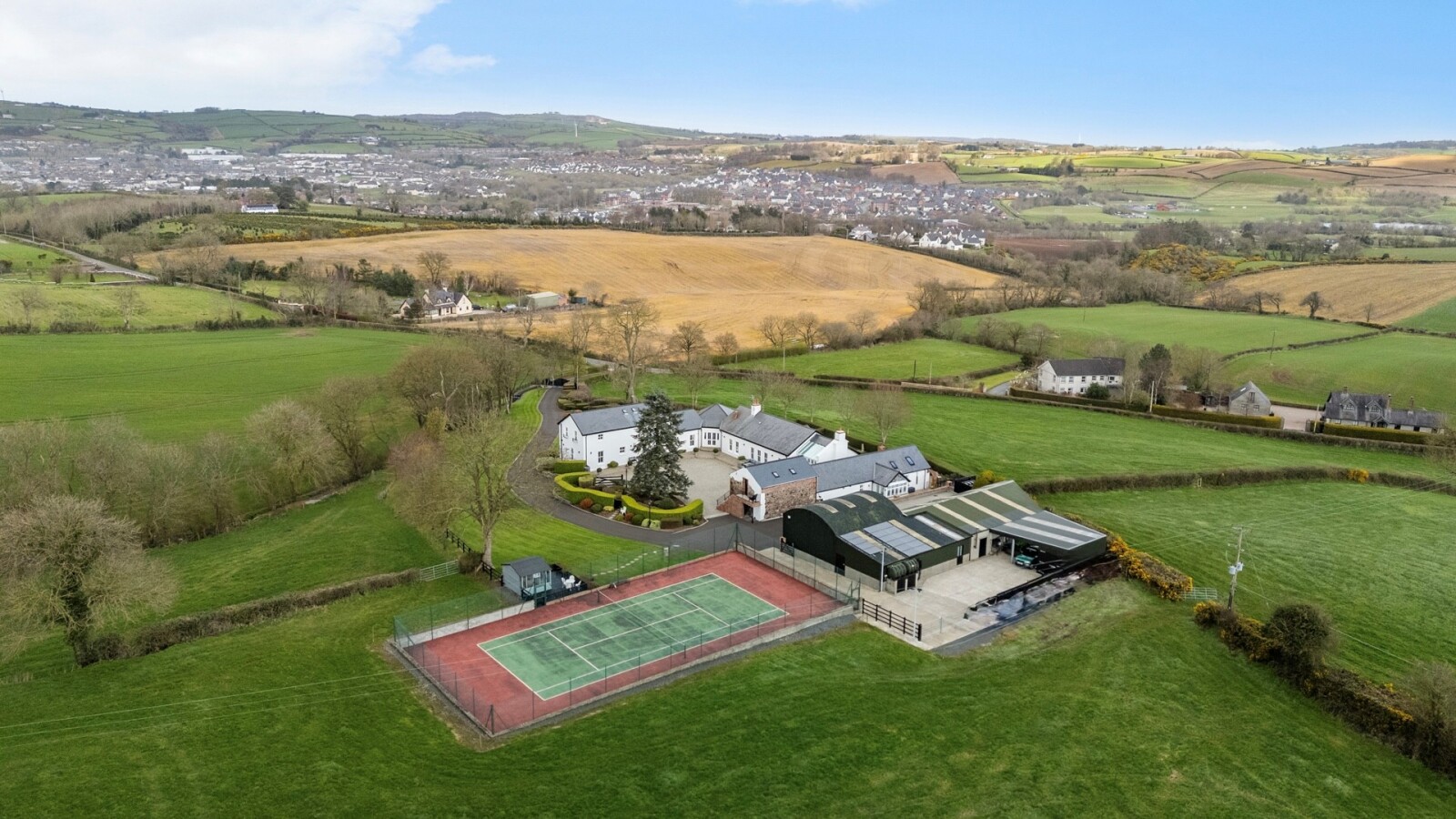 Externally, the property is equally impressive. The grounds are laid out in rolling lawns with mature trees, a full-size tennis court, and a range of outdoor entertaining areas, including a raised decked viewpoint capturing the spectacular surroundings. A charming stream, the Ballyrussell Burn, meanders through the lower part of the site, adding a unique natural feature.