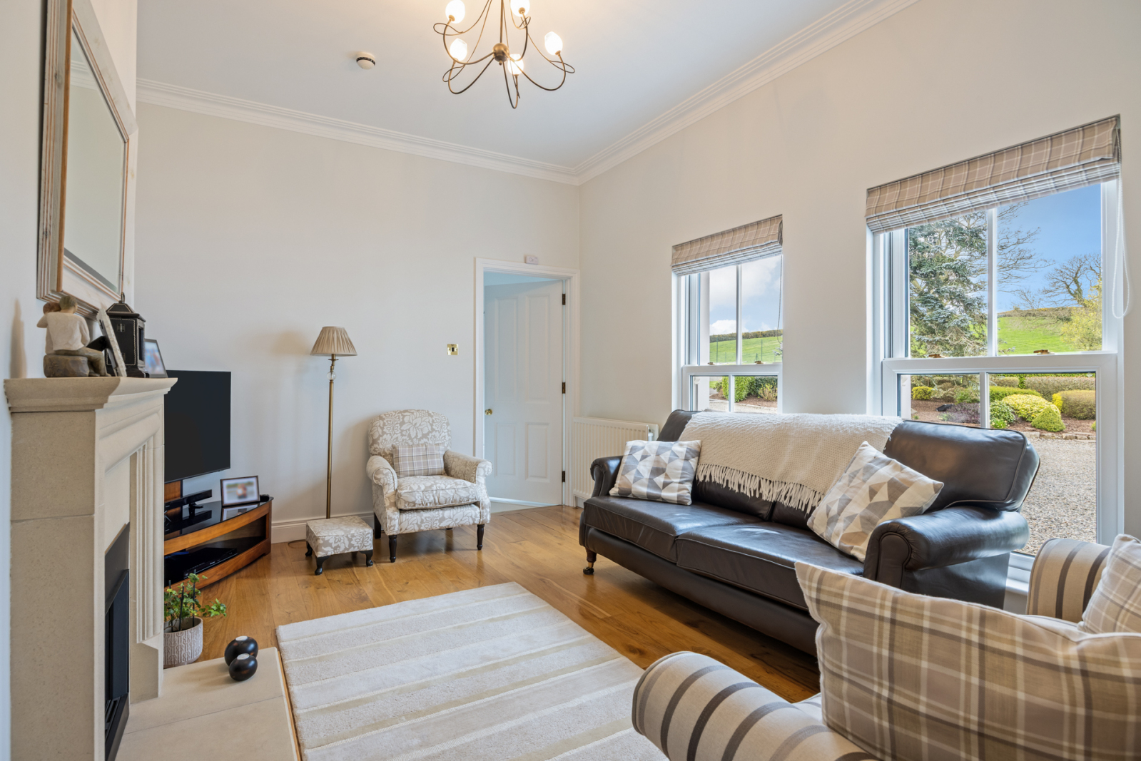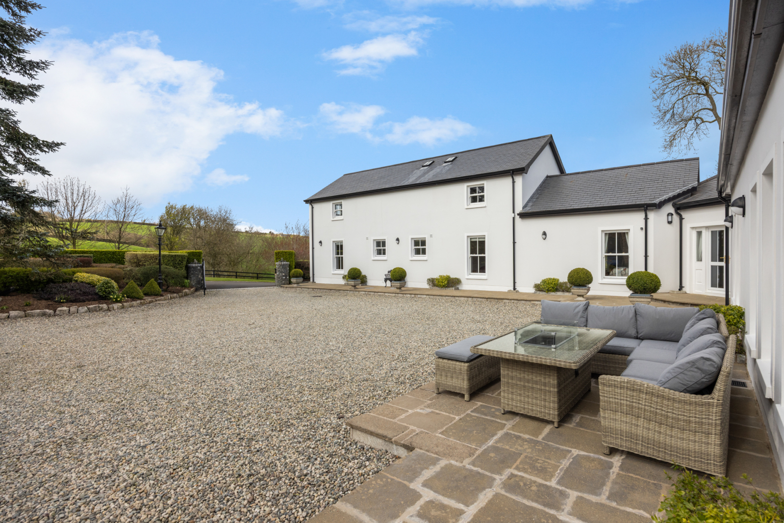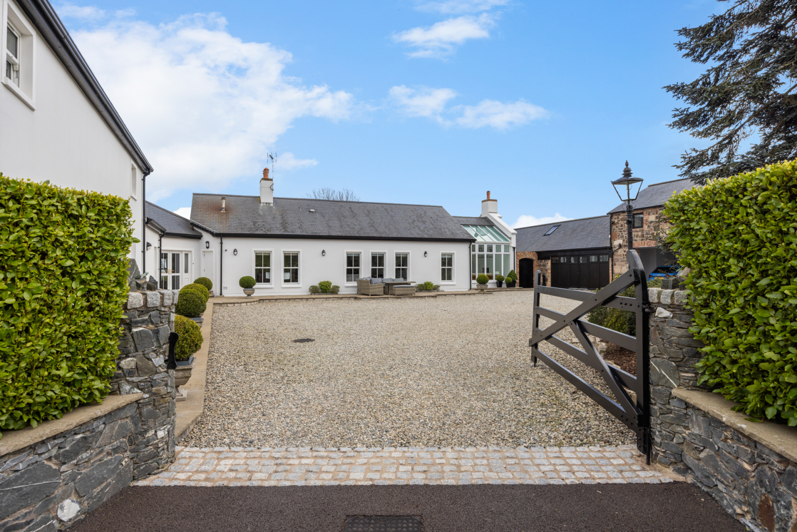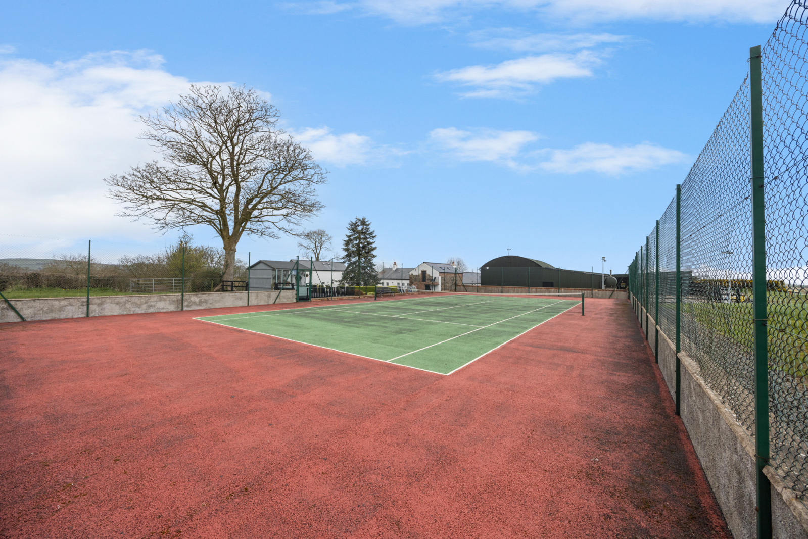 Externally, the property is equally impressive. The grounds are laid out in rolling lawns with mature trees, a full-size tennis court, and a range of outdoor entertaining areas, including a raised decked viewpoint capturing the spectacular surroundings. A charming stream, the Ballyrussell Burn, meanders through the lower part of the site, adding a unique natural feature.