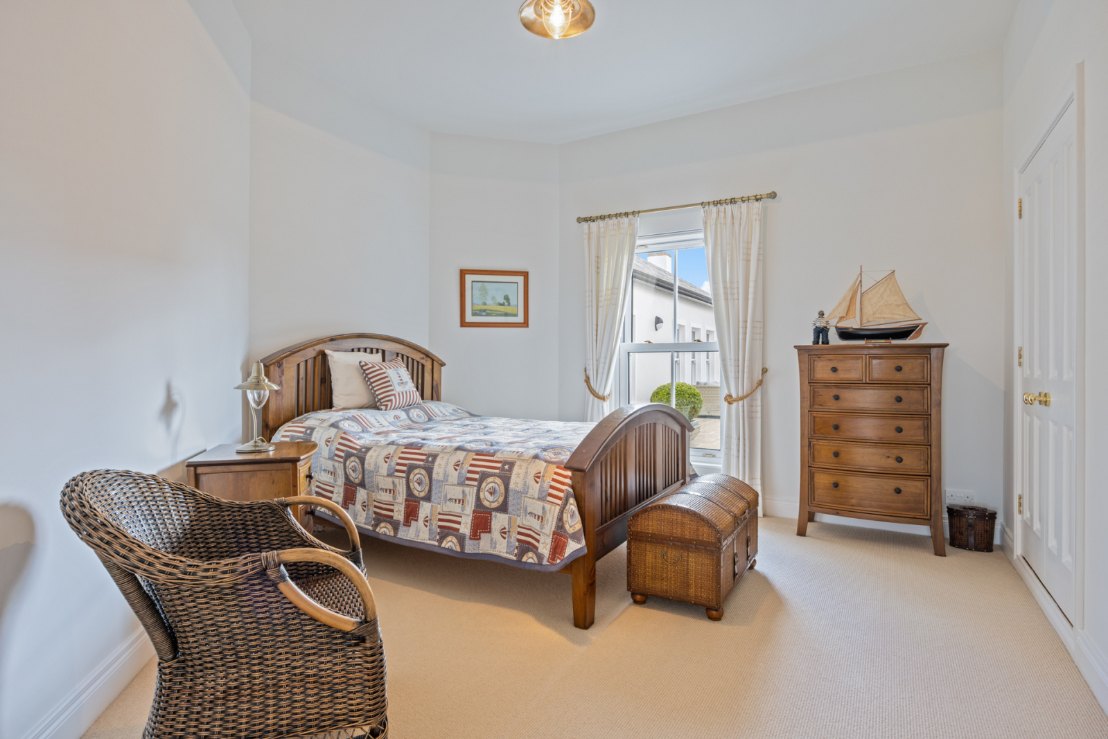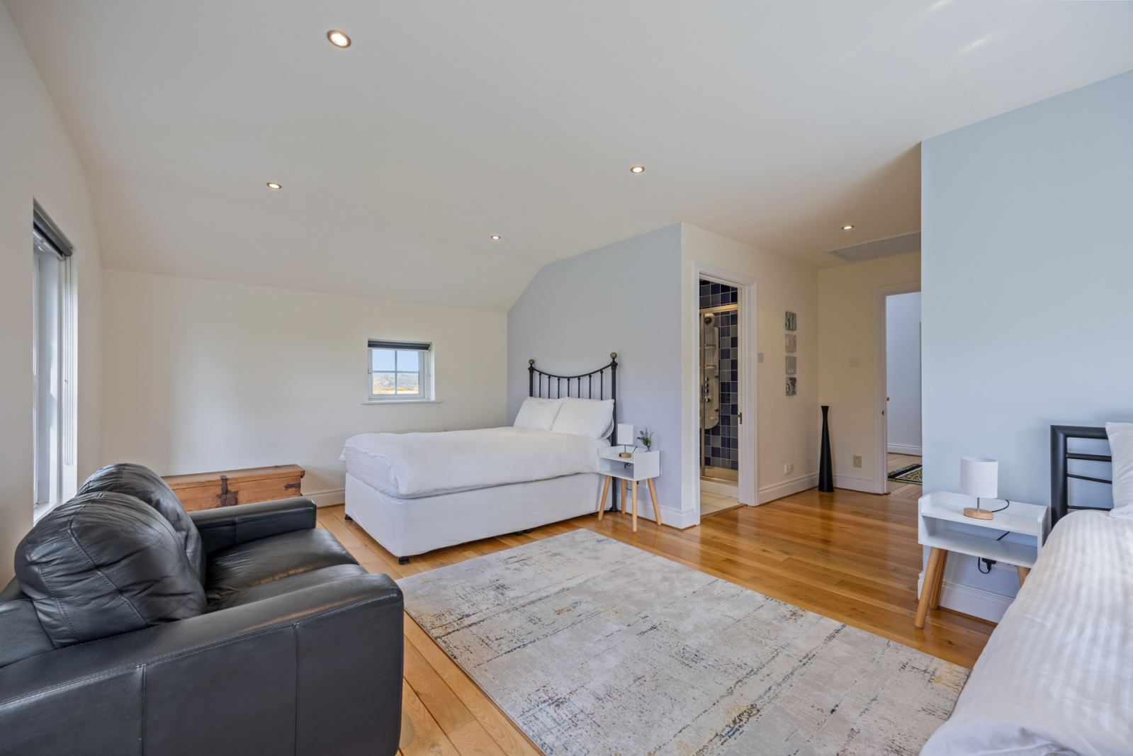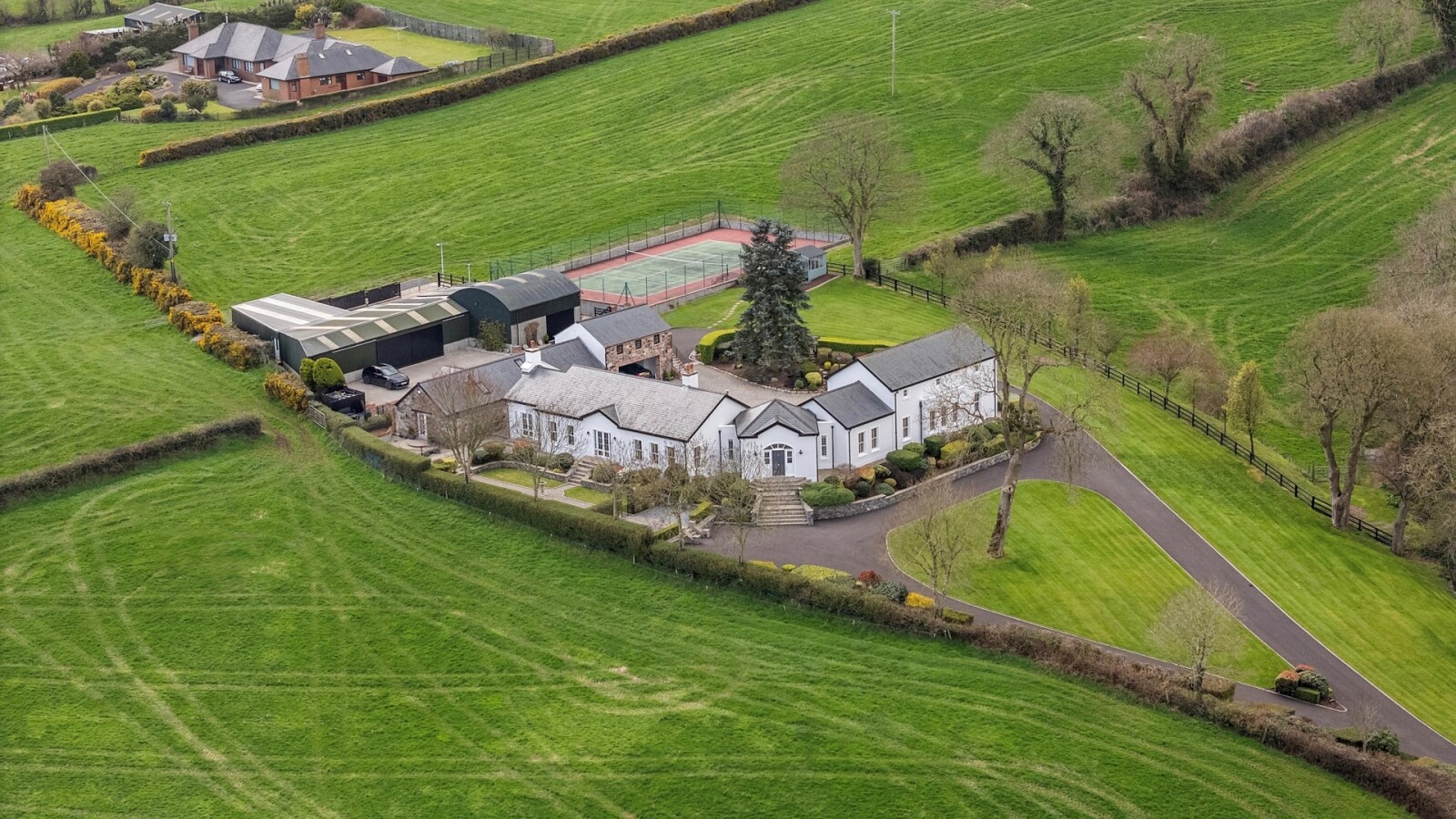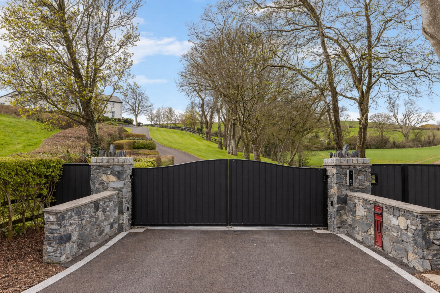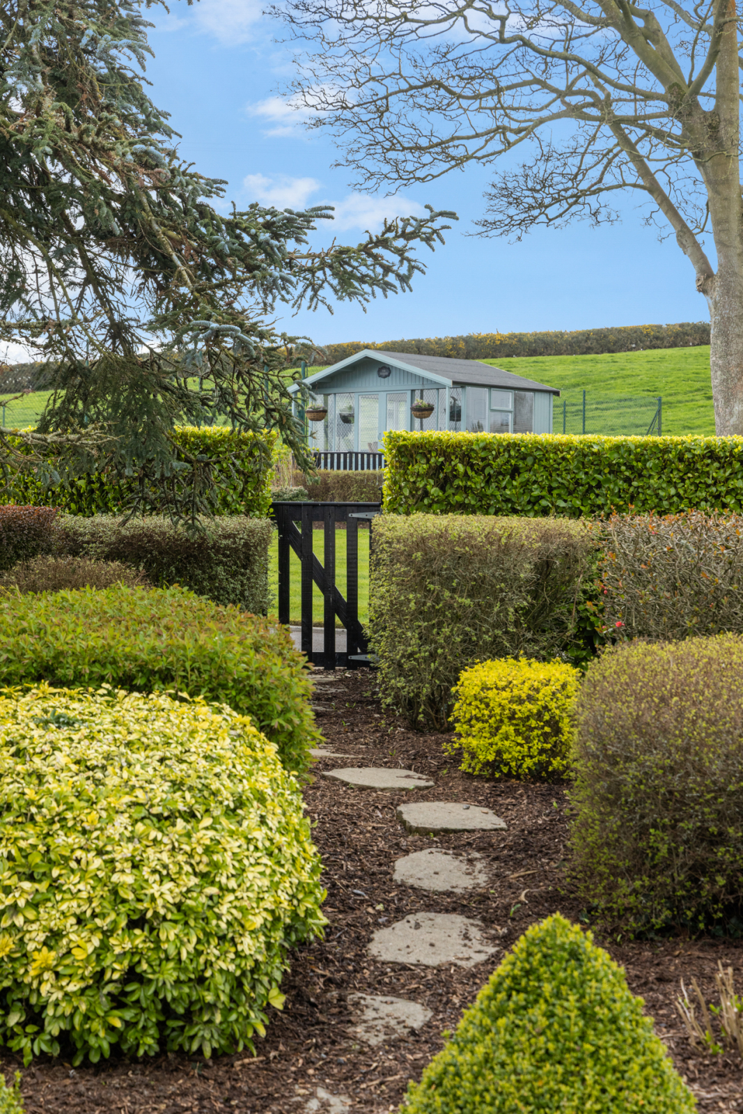 Externally, the property is equally impressive. The grounds are laid out in rolling lawns with mature trees, a full-size tennis court, and a range of outdoor entertaining areas, including a raised decked viewpoint capturing the spectacular surroundings. A charming stream, the Ballyrussell Burn, meanders through the lower part of the site, adding a unique natural feature.