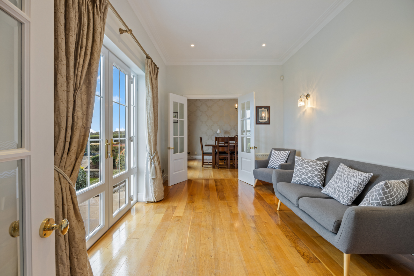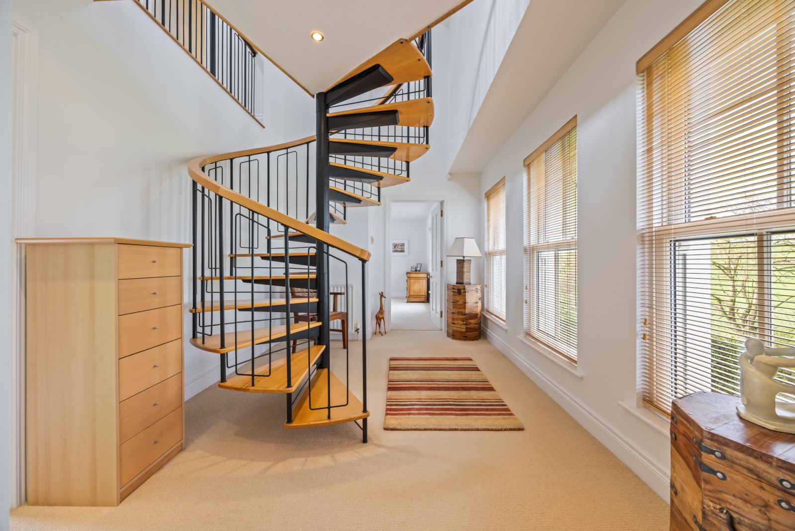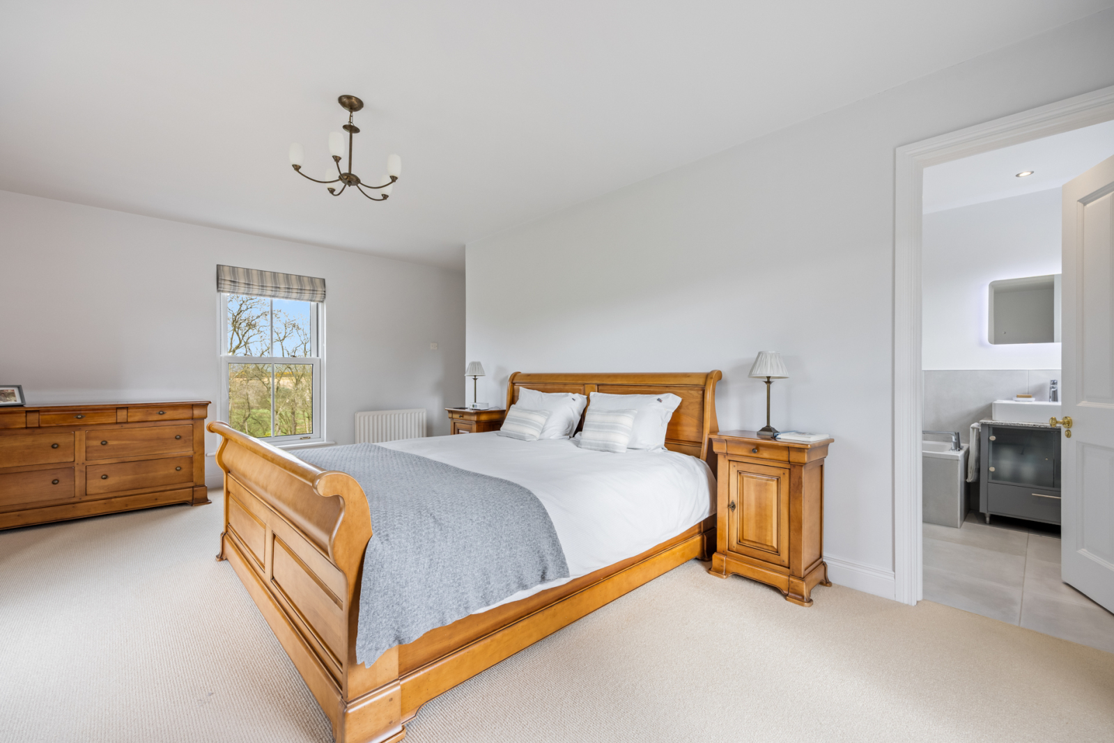 The property offers five generous bedrooms, including a luxurious principal suite with dressing room and ensuite, alongside one further ensuite bedroom with walk-in wardrobes, and a well-appointed family bathroom.